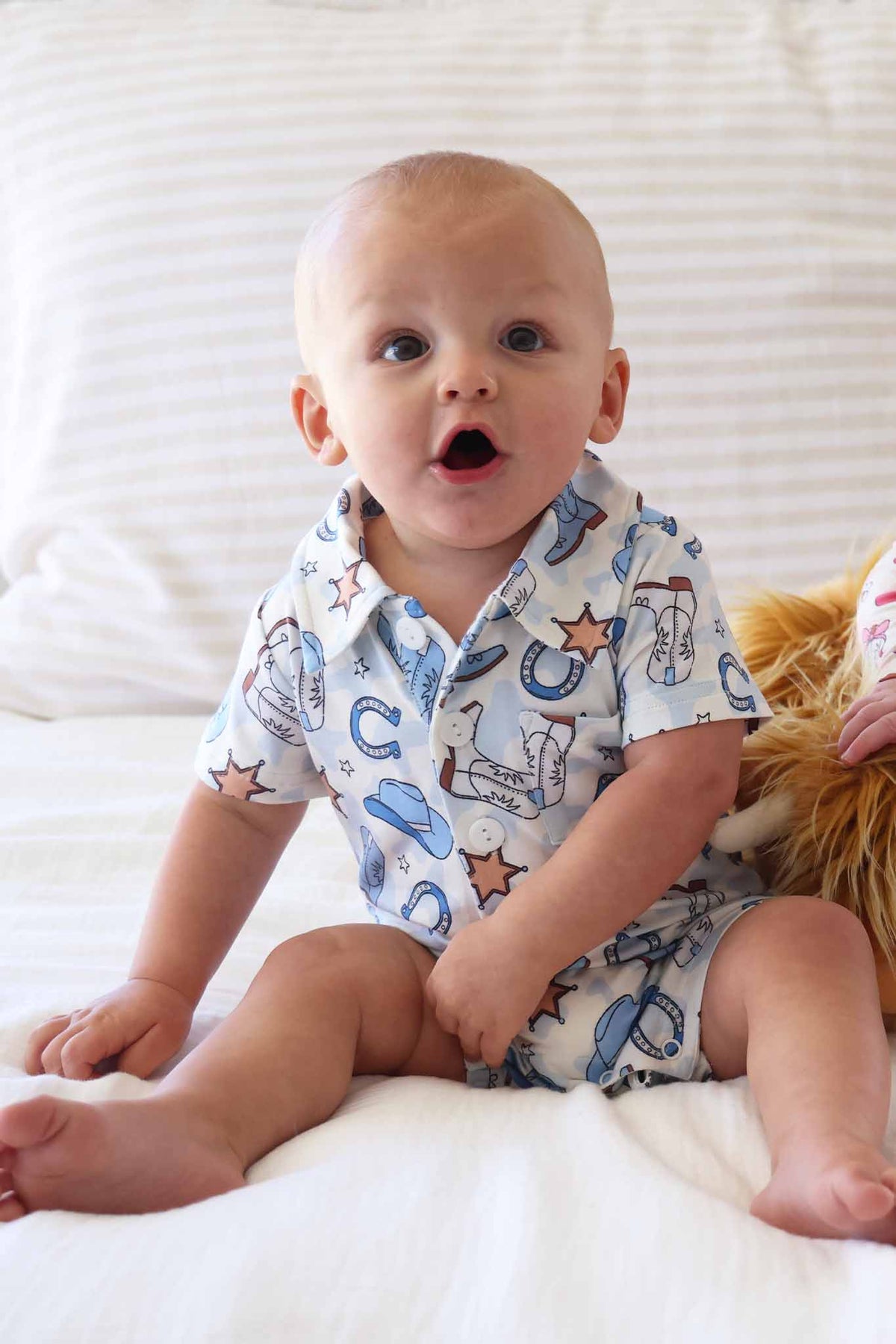 boy sitting on bed in short sleeve collared  button up casual romper in blue rodeo dreams print