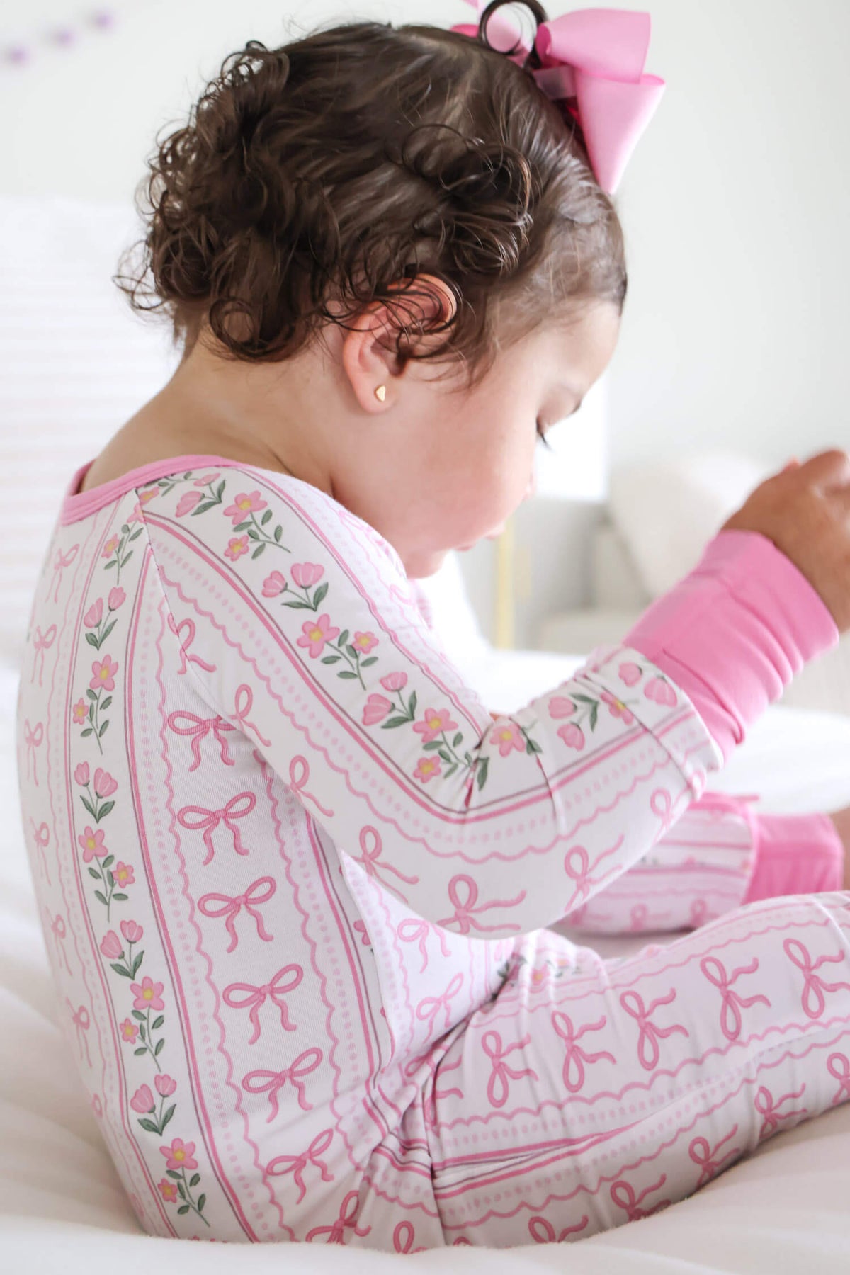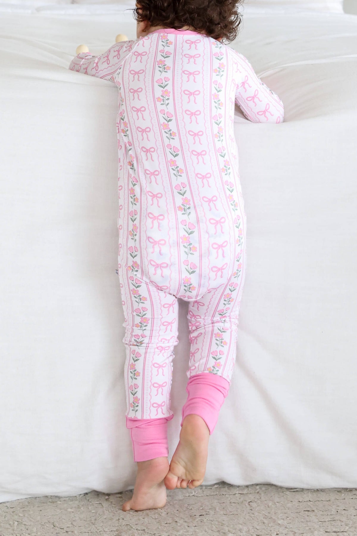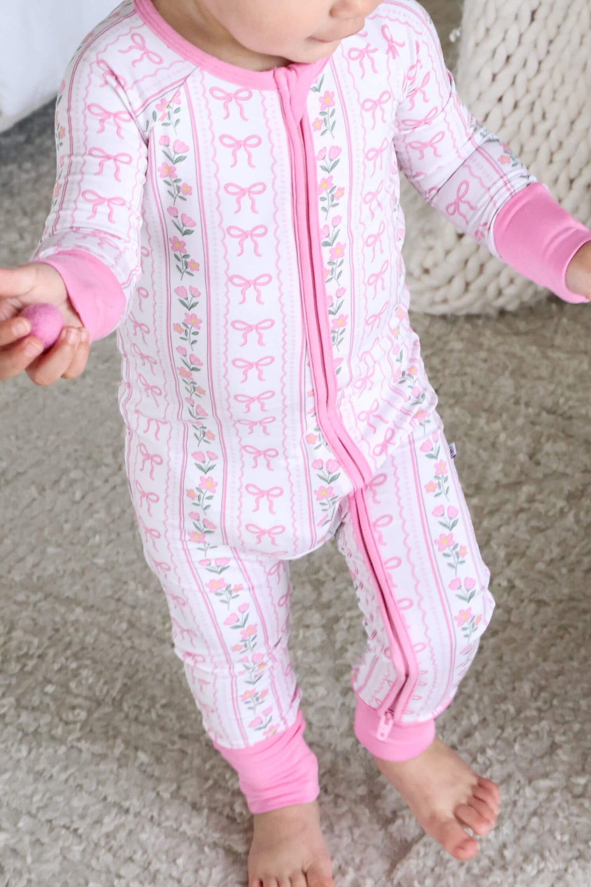 Soft, sweet, and designed for everyday ease, this convertible zip romper in Coquette Garden brings a delicate, feminine touch to your little one’s routine. Pretty pink bows and dainty florals come together on a neutral backdrop, creating a look that feels classic and effortlessly pretty. The convertible design allows you to switch from footed to footless with ease, making it perfect for both sleep and play. A full-length zipper keeps changes quick and simple, while the soft, breathable fabric keeps baby comfortable throughout the day and night!