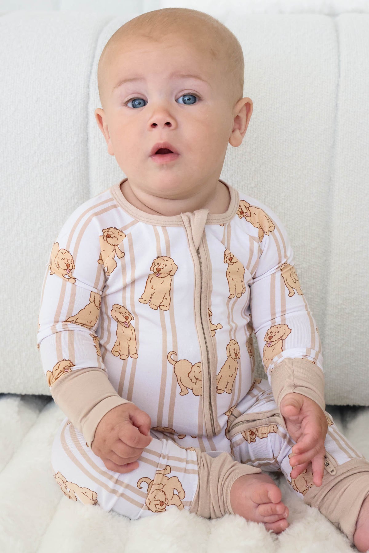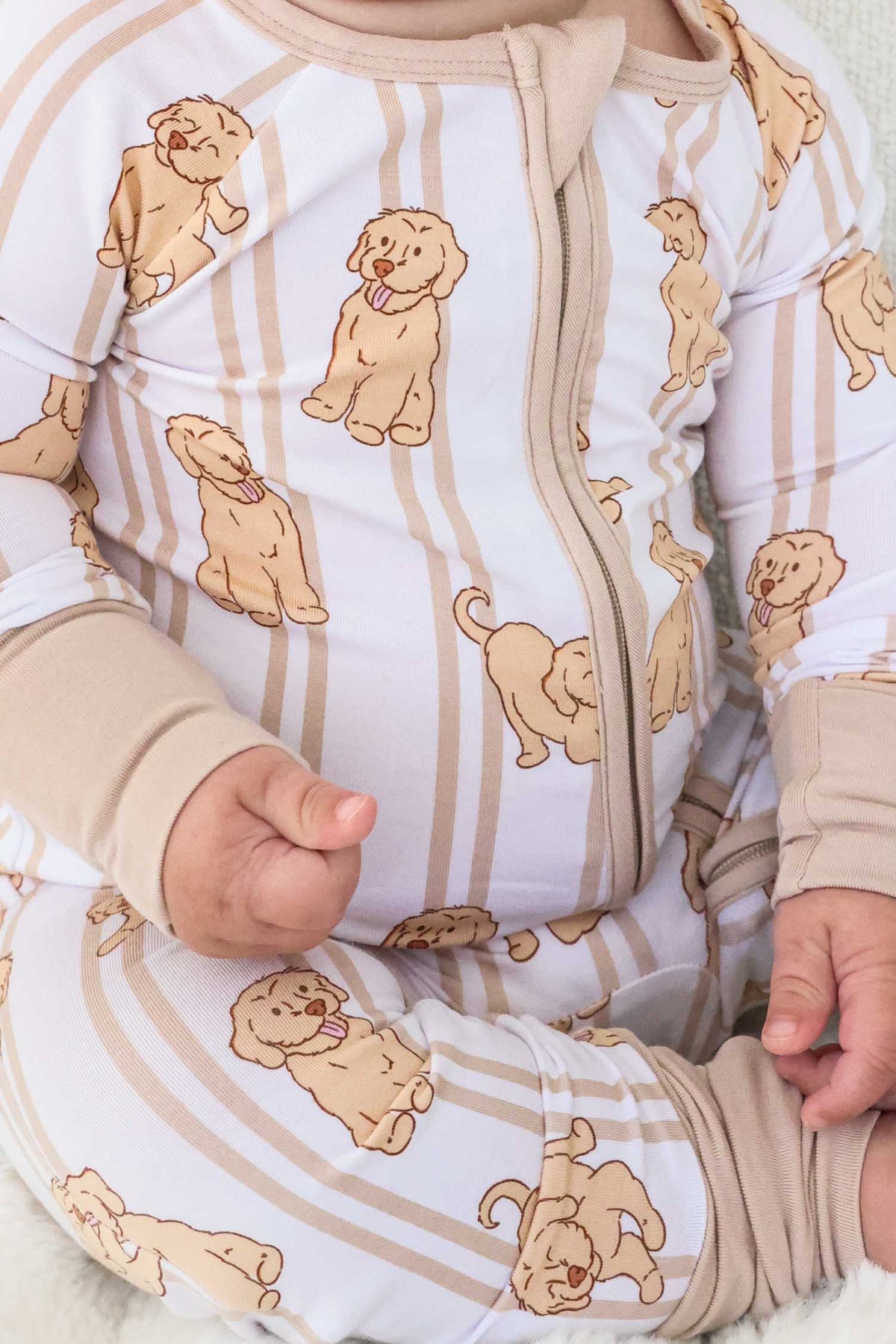 caden lane convertible zip romper with golden retriever print for babies