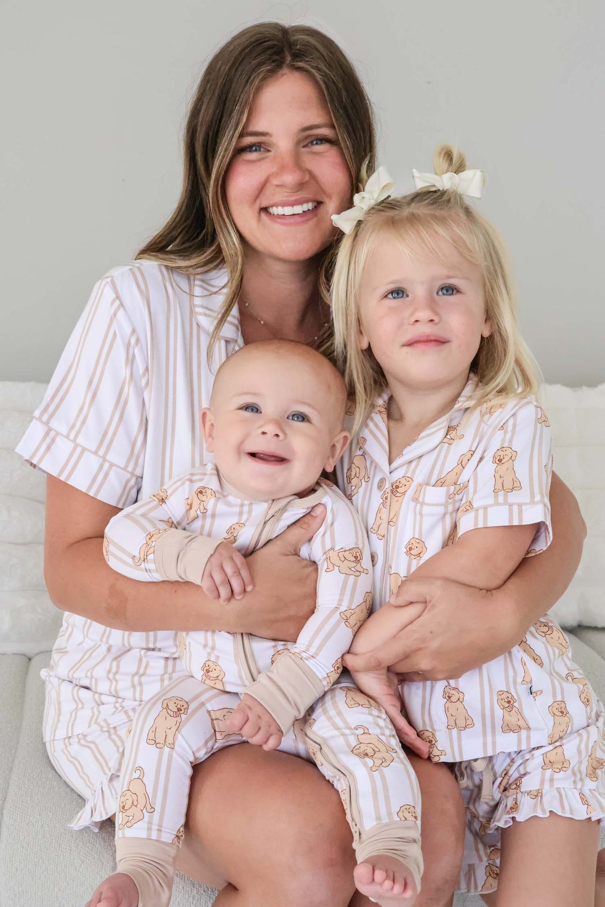 Playful and easy to wear, this convertible zip romper brings a touch of puppy love to your little one’s bedtime routine. Sweet puppies are paired with soft neutral stripes to create a look that feels light, classic, and easy to love. Designed with versatility in mind, the convertible design allows you to switch from footed to footless in seconds. The full-length zipper makes changes quick and simple, while the soft, breathable bamboo fabric keeps your baby comfortable from morning to night. This romper pairs effortlessly with the coordinating striped option for mom for the cutest coordinated look!