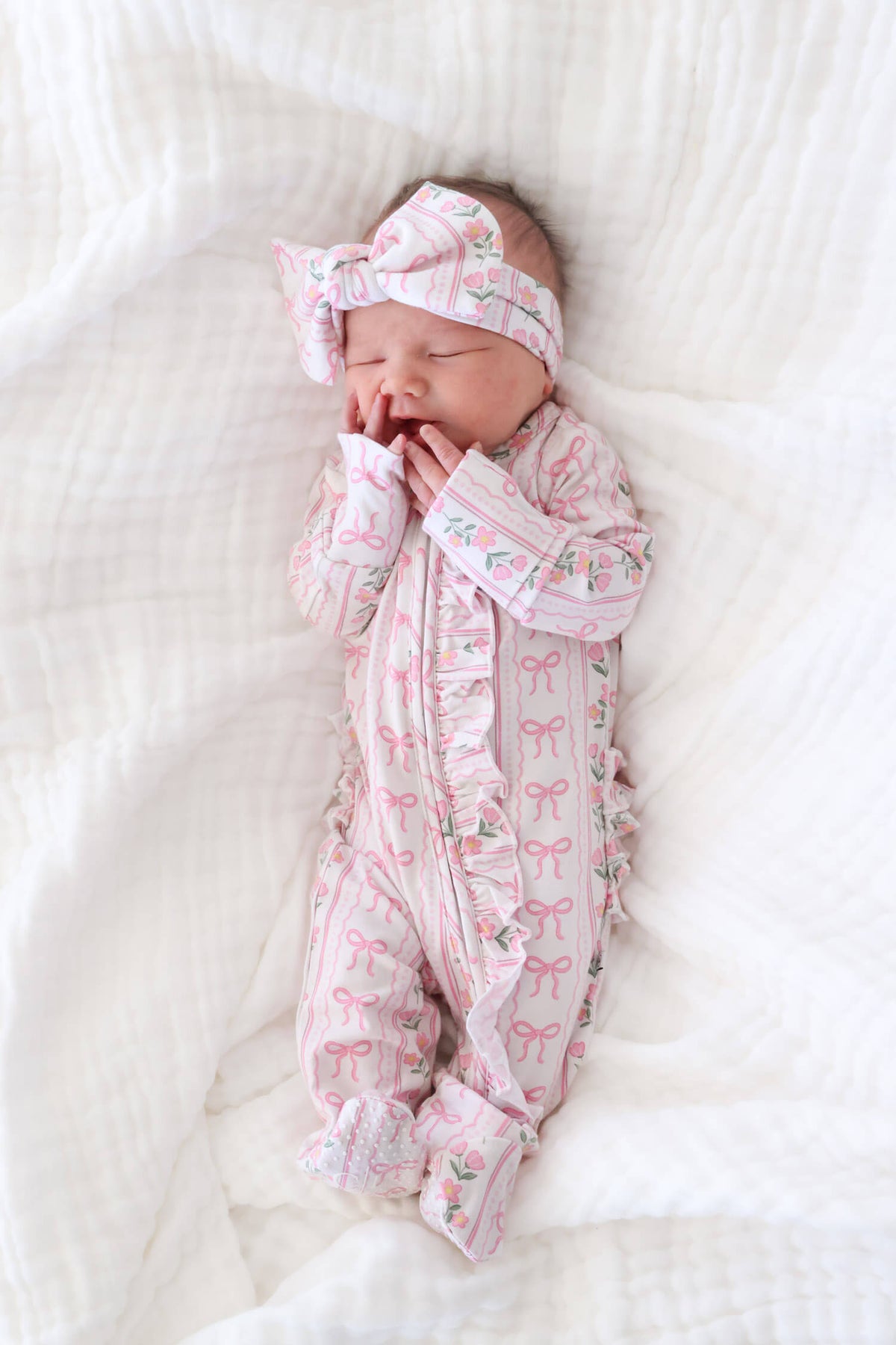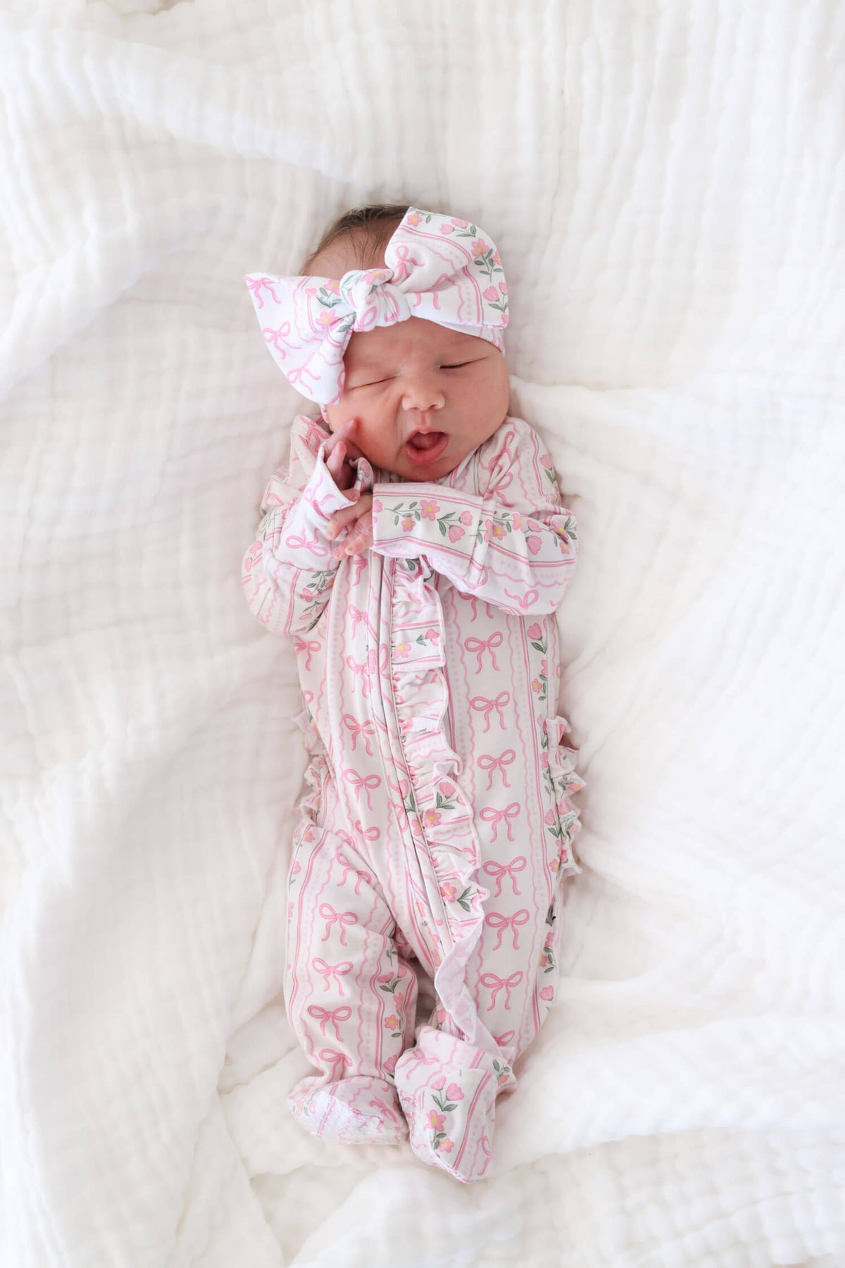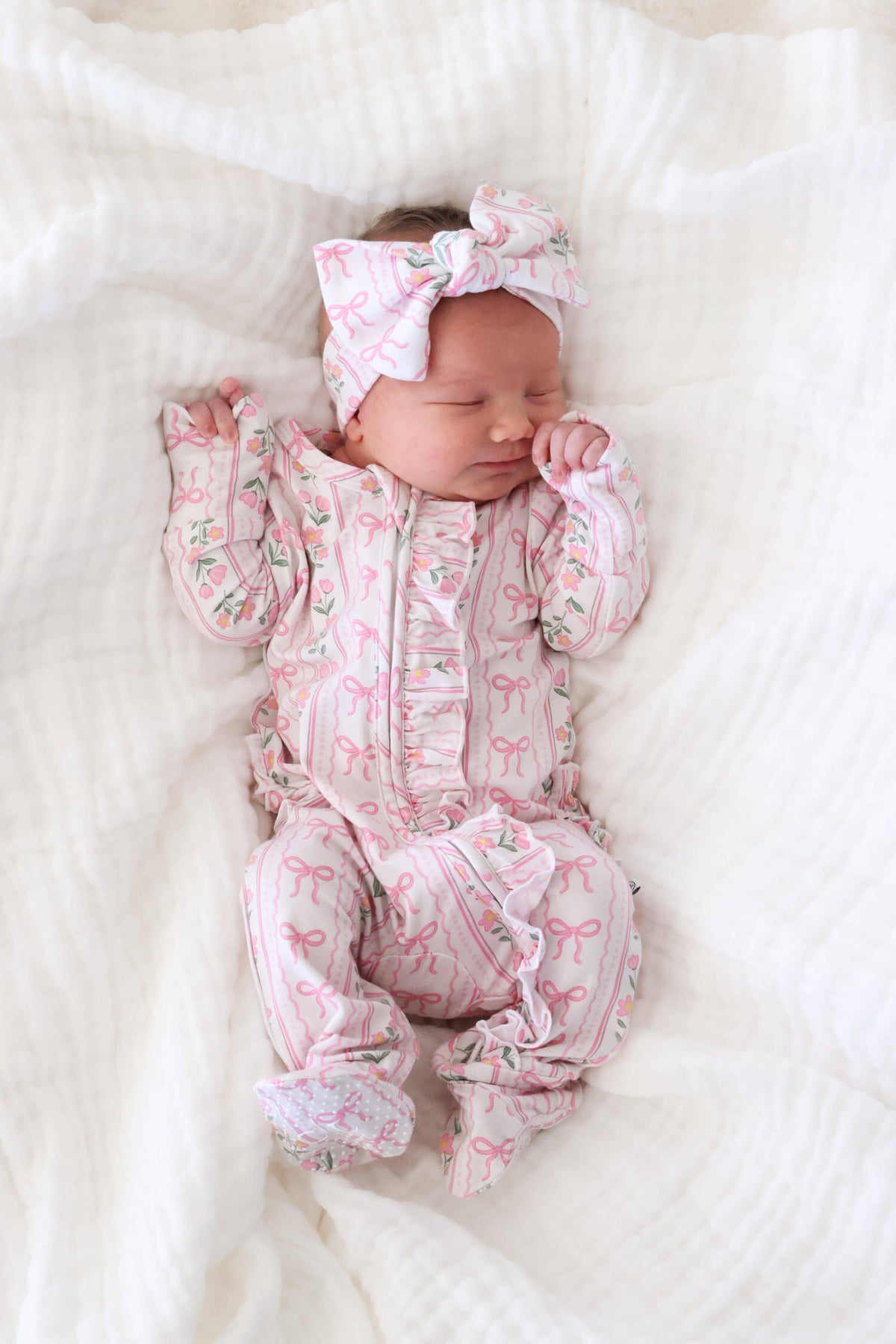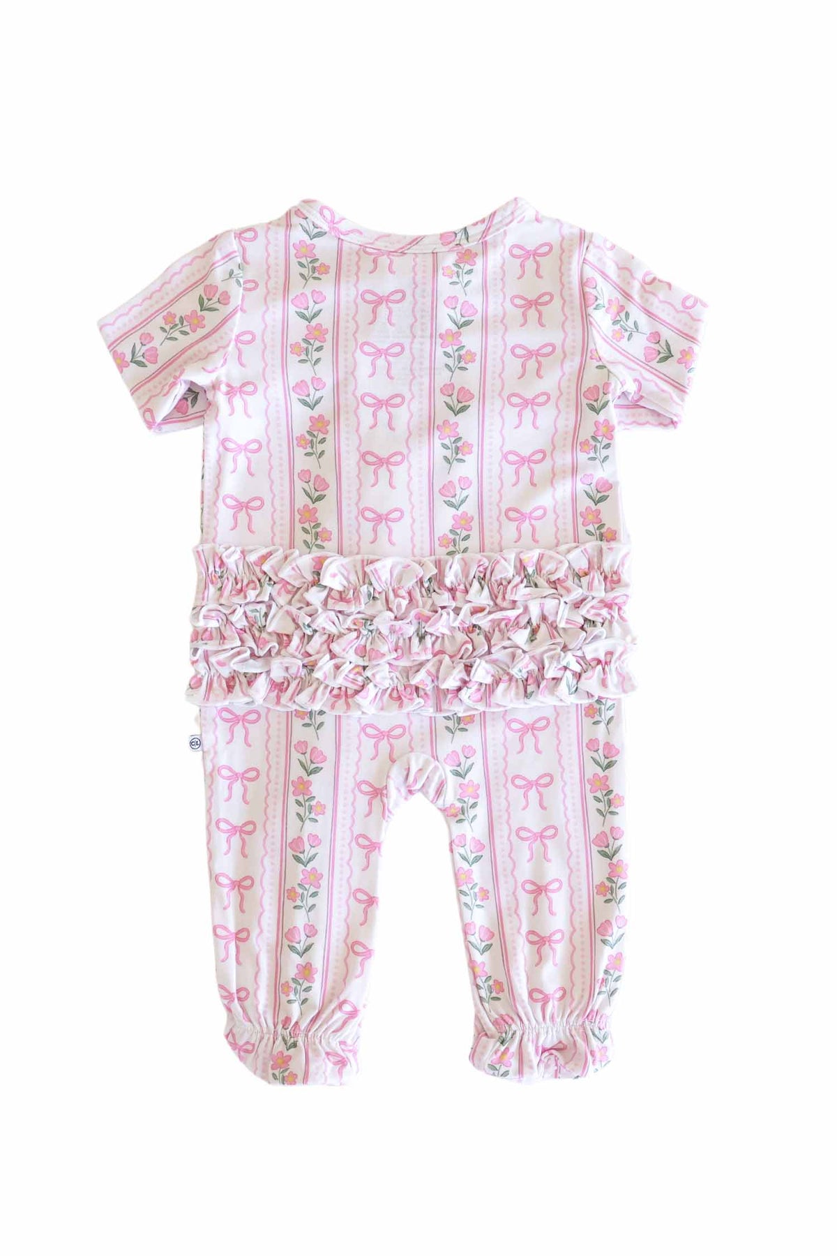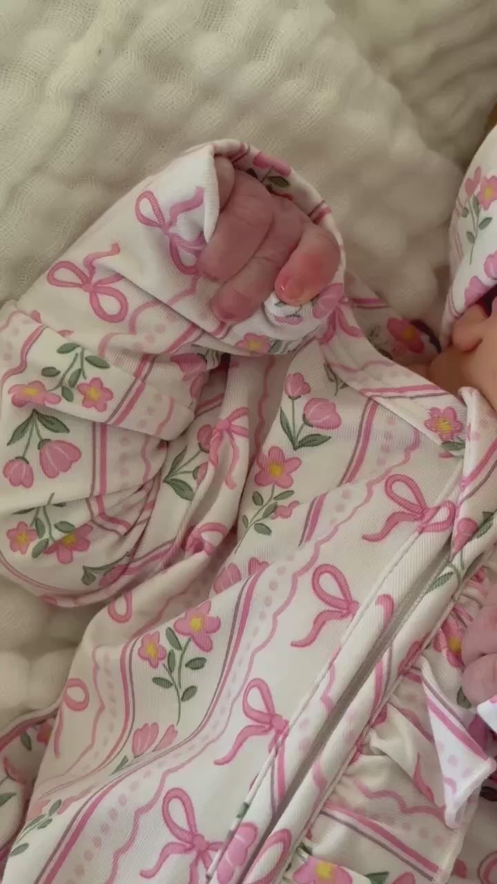 Soft, sweet, and thoughtfully detailed, the ruffle zipper footie in Coquette Garden brings a delicate, feminine feel to your little one’s everyday routine. Pretty pink bows and dainty florals are layered across a soft neutral backdrop, creating a look that feels timeless and effortlessly pretty. Designed for both comfort and ease, it features a full-length zipper for quick changes and gentle ruffle details for an added touch of softness. The breathable bamboo fabric keeps your little one cozy from morning snuggles to bedtime routines, and pairs with the matching lounge set for mom for a look that is comfy and cute as can be!