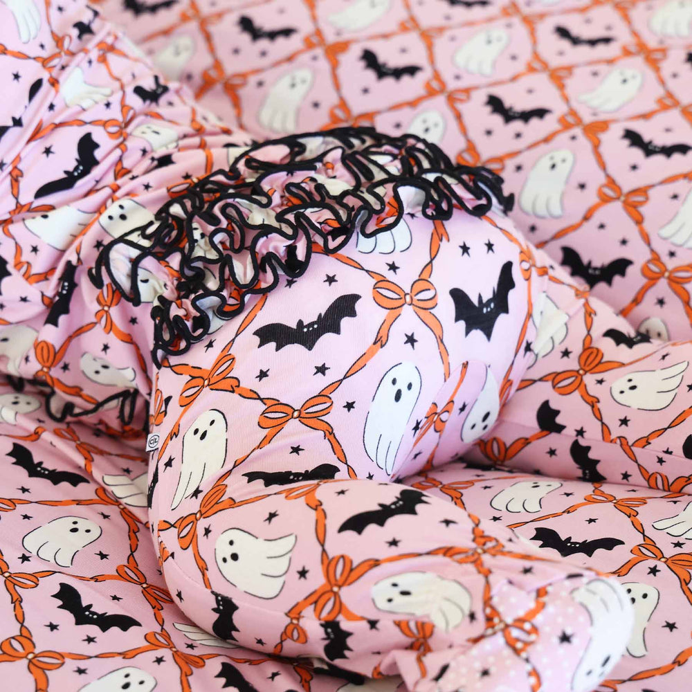 Calling all spooky sweethearts! The Boo Babes Collection was made for all the little ghouls who love to give a good scare and look cute while doing it. This girly Halloween print features friendly ghosts, flying bats and bright orange bows all floating on the dreamiest pink background. These irresistibly cute pajamas glow in the dark for an extra pop of boo-tiful magic one the lights go out to make bedtime even more fun. Crafted from buttery-soft bamboo viscose, this festive collection is packed with matching styles for babies, big kids, and moms for the cutest family matching moments. From twirl dresses and zip rompers to cozy pajamas, personalized blankets, and accessories, you can dress your whole boo crew in playful pink from head to toe. Perfect for trick-or-treating or pumpkin patch twirling, Boo Babes will make your spooky season just as sweet as it is scary.