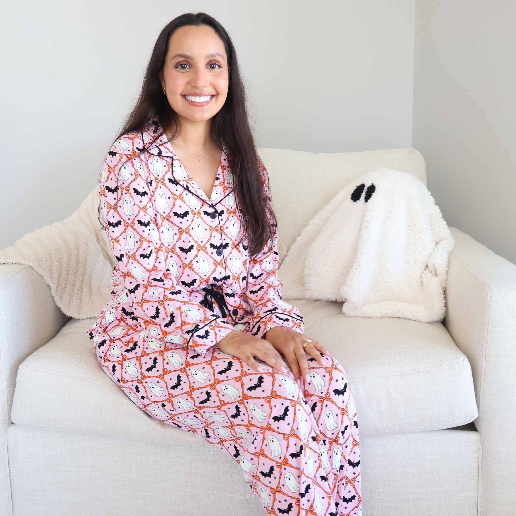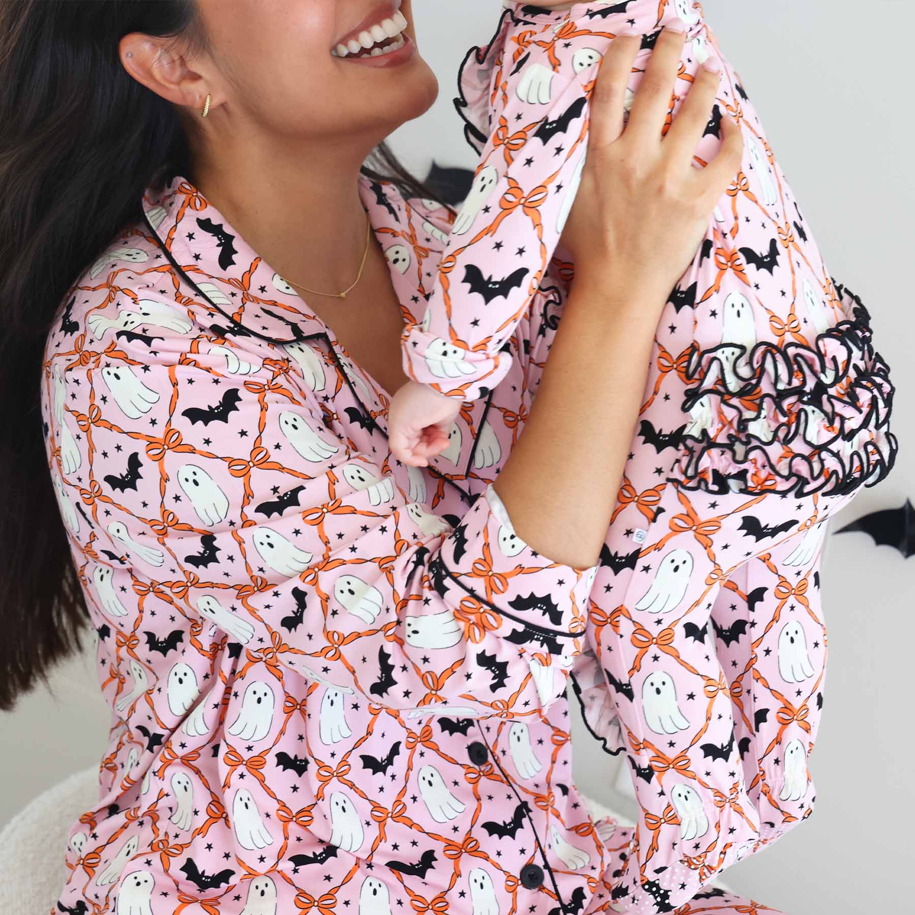 Get cozy and spooky in style! Our Boo Babes glow-in-dark women’s lounge set features a girly pink Halloween print filled with friendly ghosts, fluttering bats and orange bows all on buttery-soft bamboo viscose that feels just as good as it looks. This two-piece set includes a long sleeve, button-up top with a classic collar and relaxed flare pants for a flattering and comfy fit. Whether you're curling up on the couch, taking your little boos trick-or-treating, or snapping festive fall photos, this glow-in-the-dark set makes it easy to match with your minis in head-to-toe Halloween cuteness.