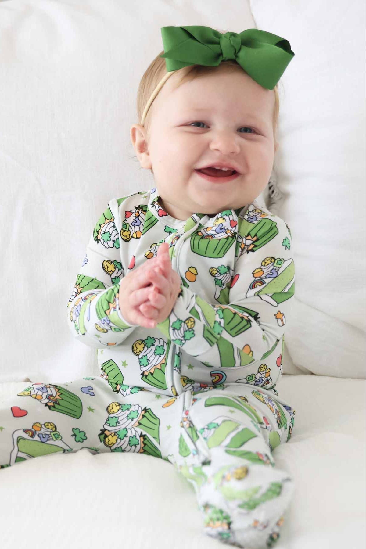 Celebrate St. Patrick’s Day with a little sprinkle of sweetness! Our Shamrock Sweets Zipper Footie is covered in green cupcakes, tiny shamrocks and fluffy cake slices that create a vibrant holiday look that's fun and fresh. The two-way zipper makes changes quick and easy, while the gentle stretch keeps your little one comfortable morning to night. This footie brings a fun St. Patrick’s Day feel to your everyday routine in the sweetest, tastiest way!