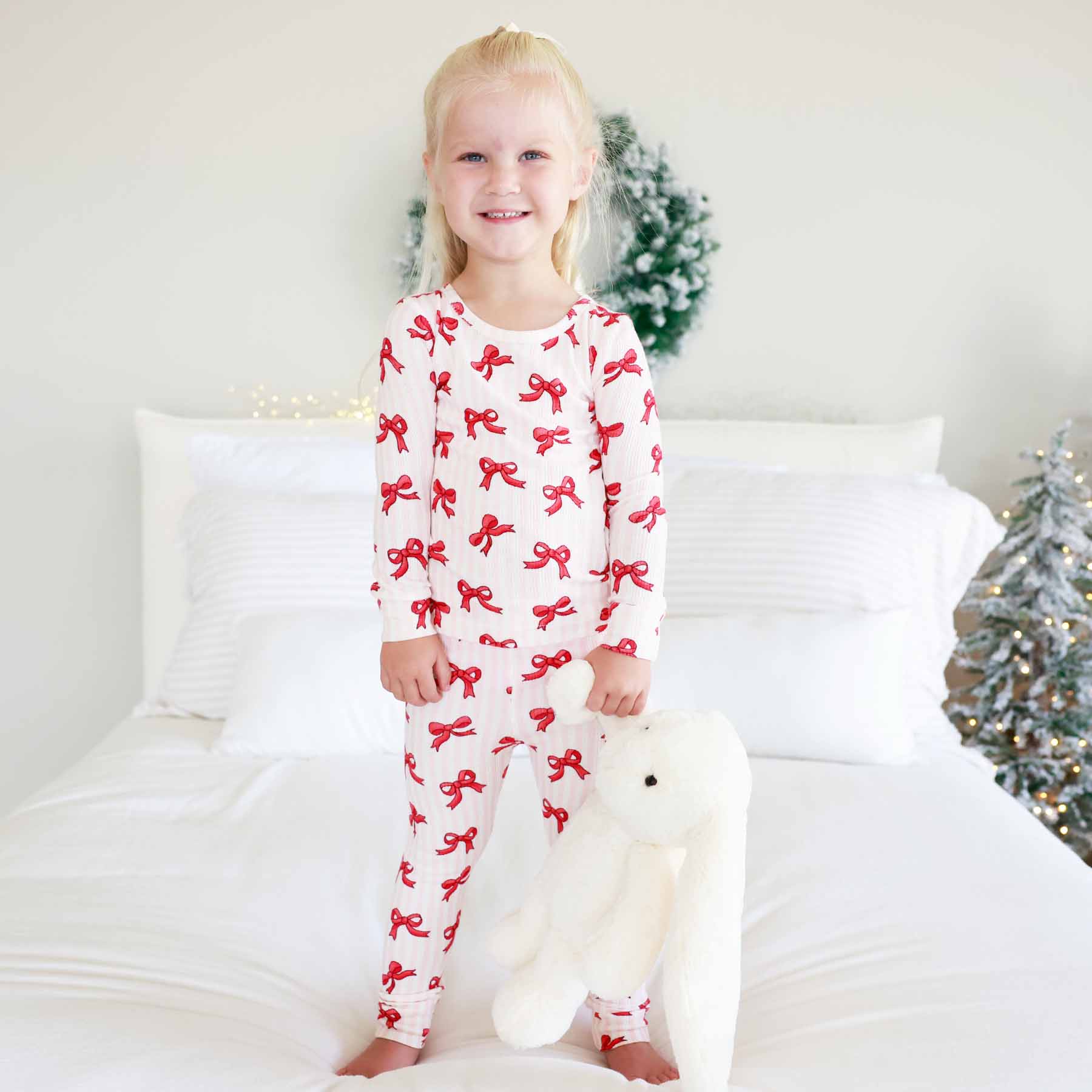 pink stripe and red bow bamboo waffle girls two piece pajama set coquette christmas