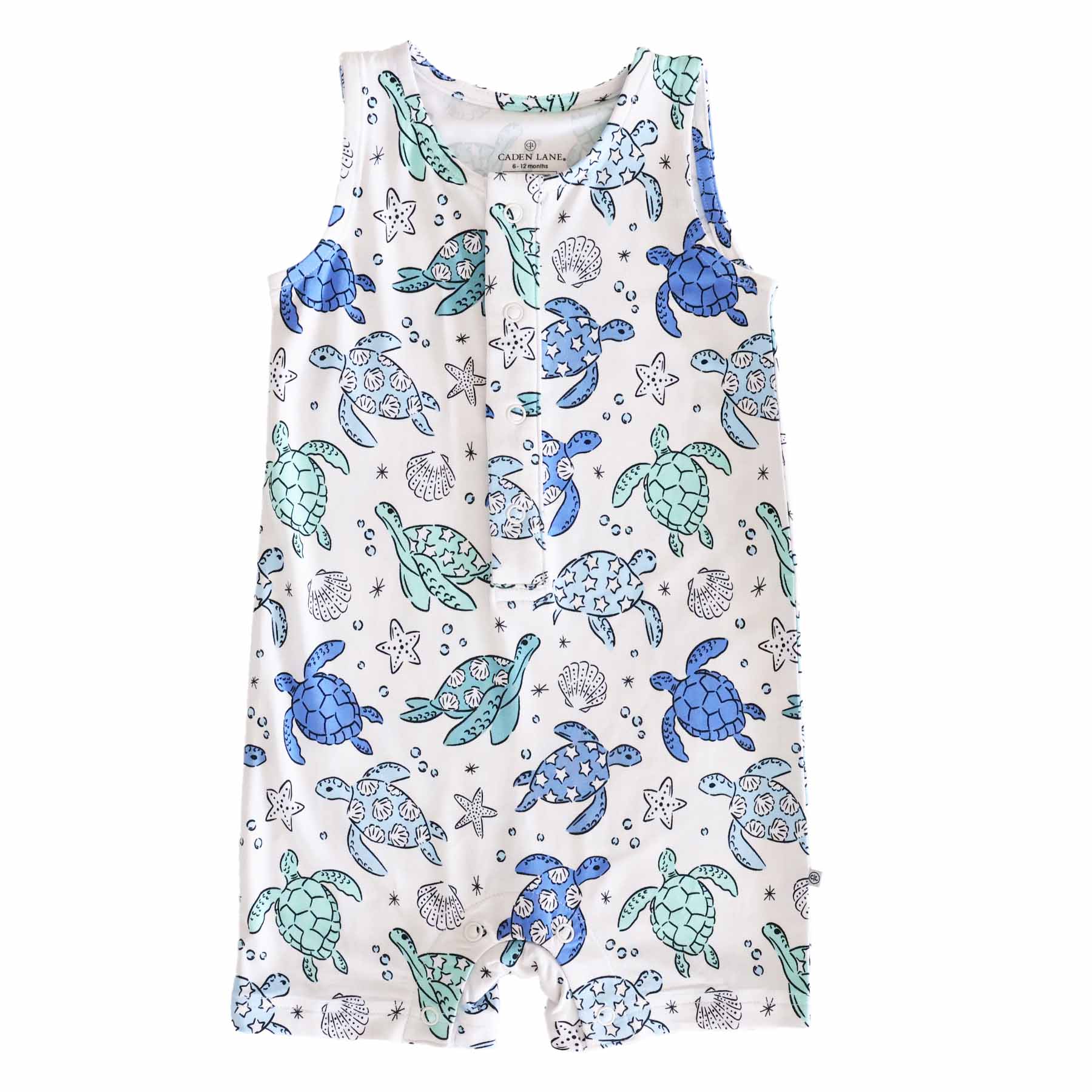 Bursting with vibrant shades of ocean blue and tropical green, this playful sea turtle print is perfect for your little beach buddy. Whether he's headed to the pool, playing in the backyard, or enjoying a seaside stroll, he’ll stay cool and comfortable in this adorable one-piece romper. Crafted from ultra-soft and breathable bamboo viscose, this romper is designed to keep your baby comfy and cool on even the sunniest days. The lightweight fabric is naturally temperature-regulating and moisture-wicking, making it ideal for summertime adventures. Sleeveless with short legs, this snap romper offers maximum airflow for nap time, play time and all the time. Snap closures along the front make dressing and diaper changes a breeze, so you can spend more time soaking up those sunny smiles and less time fussing with buttons. Plus, the stretchy material allows your little guy to move freely, whether he’s scooting across the floor or cuddled up in your arms. Cute, comfy, and ready for warm-weather fun, the Sea Turtle Splash romper is a must-have for any summer wardrobe.