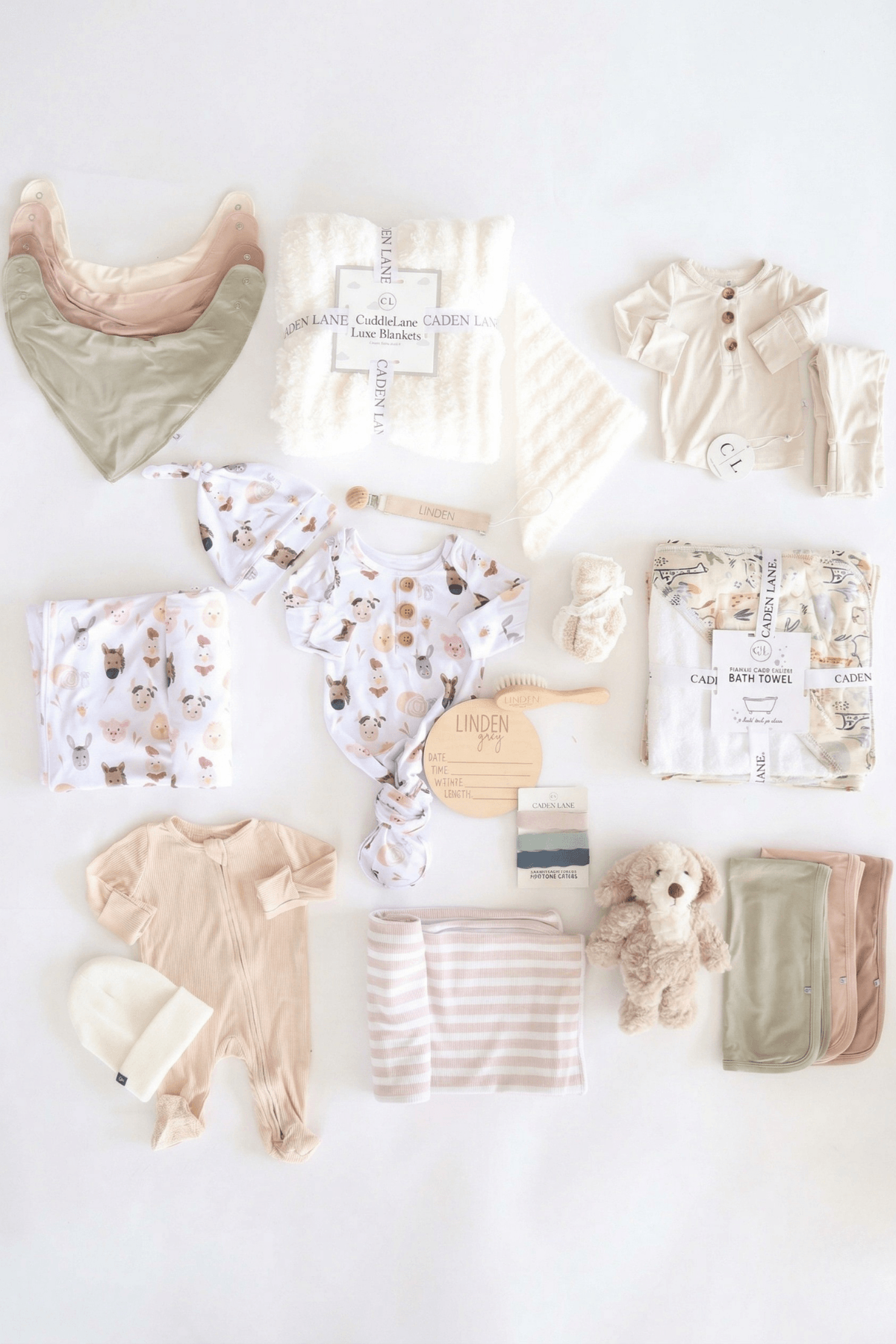 A dreamy, neutral baby shower gift that’s packed with love! This high-end barnyard themed baby shower box is filled with cozy, versatile essentials for any little bundle of joy. Each box is carefully packaged by our Texas team and filled with luxury bamboo babywear, plush blankets, and personalized keepsakes for the most memorable first moments. From buttery-soft bamboo outfits and swaddles to a luxe baby blanket and hooded towel, these sets bring comfort and convenience to new parents. With personalized touches complete with baby's name, this gift is as unique as the little one it’s celebrating. Whether it's a surprise gender reveal or just a love for neutrals, this set is the perfect way to say, "Welcome, baby!"