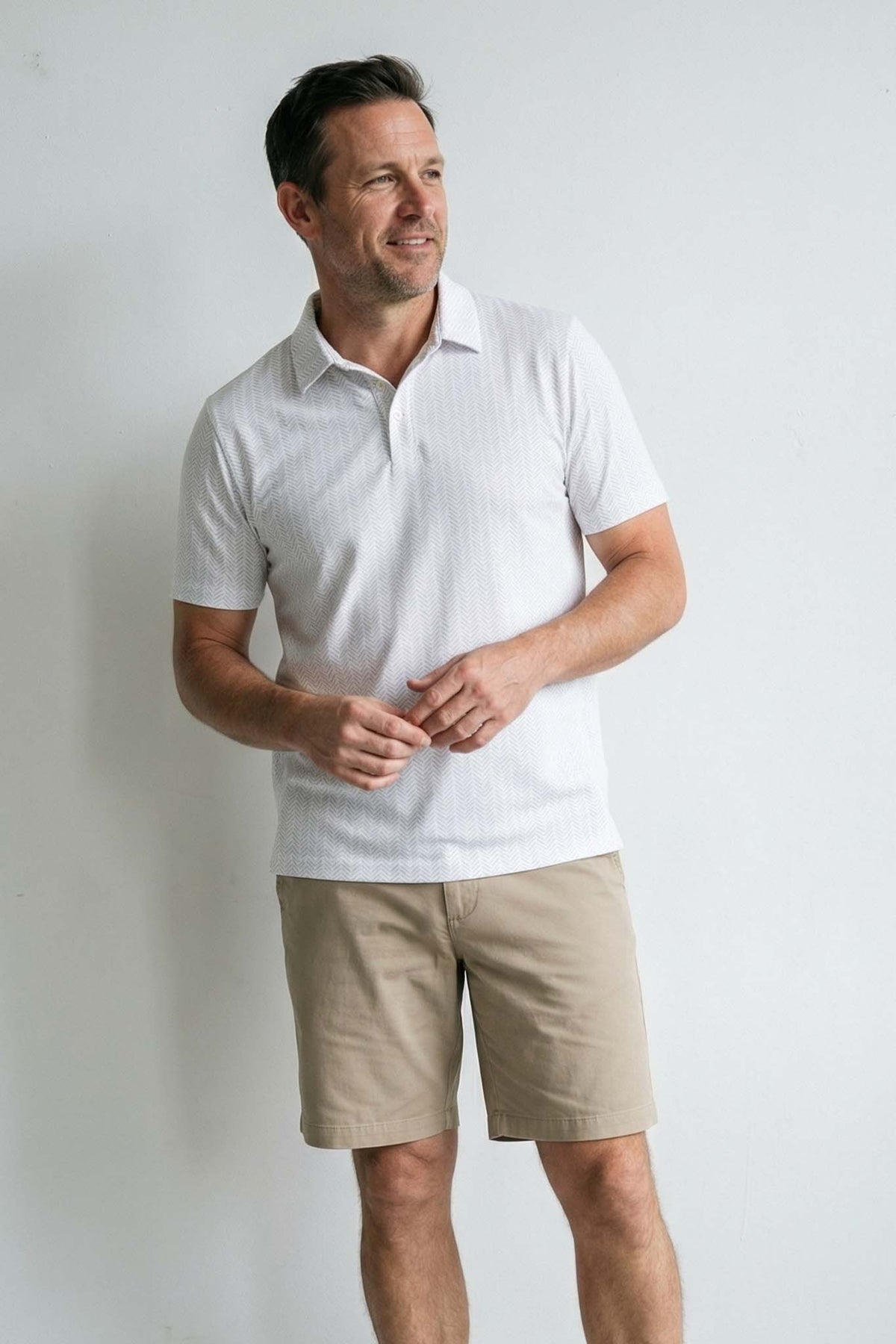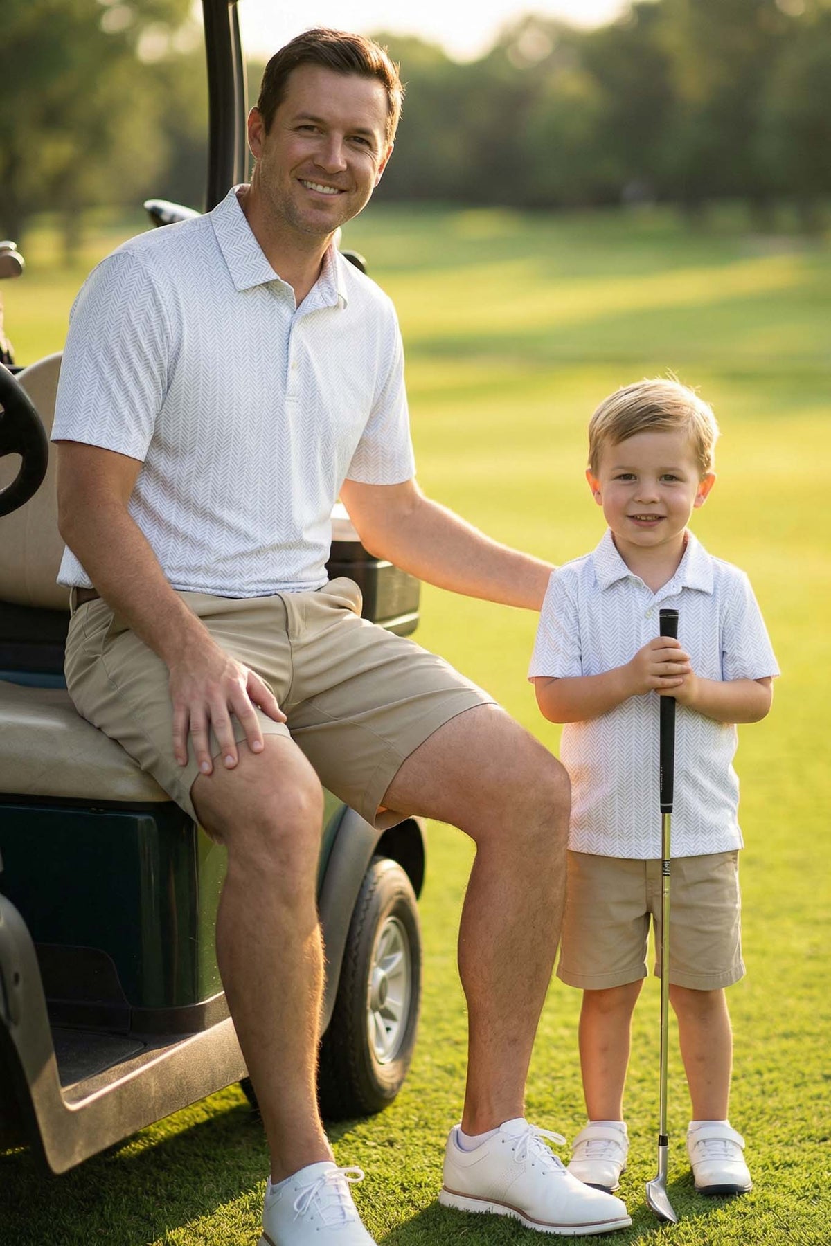 These matching polo shirts were designed for the dads and sons who are always ready for the next round! Featuring a clean, classic pattern of golf balls and tees in a neutral palette, this print feels polished, sporty, and effortlessly elevated. Crafted in our lightweight, breathable performance knit, these matching polos are moisture-wicking, quick-drying, and made for all-day comfort on and off the course. The smooth stretch fabric moves easily from early tee times to lunch at the clubhouse, keeping both big and little guys cool and comfortable.