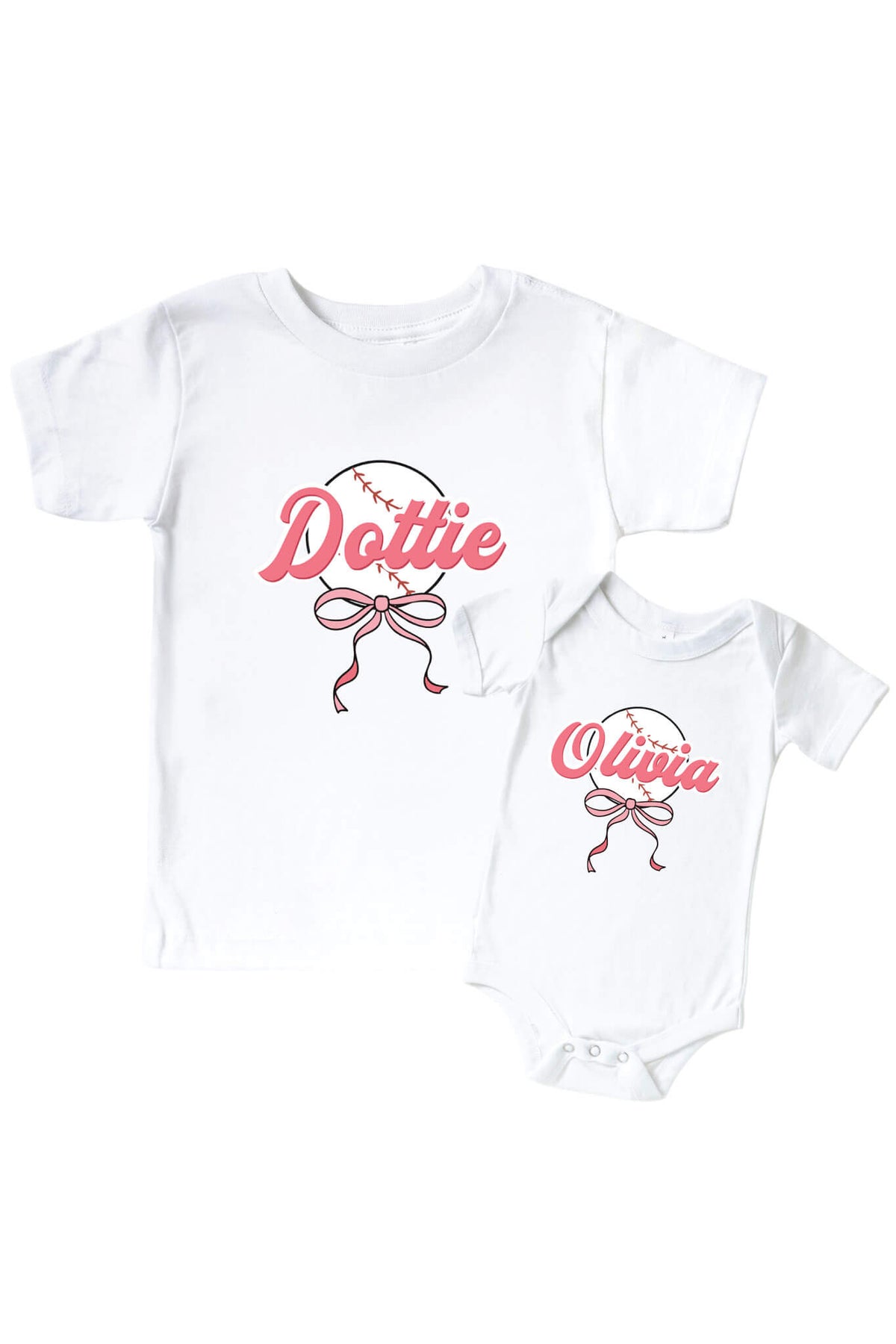 A little sugar, a little sporty, and a whole lot of cute! This personalized baseball bow graphic tee and bodysuit are made for your sweetest little slugger. Featuring her name in a soft pink script over a classic baseball design, it’s the perfect blend of girly charm and game day spirit. Whether she’s cheering on her big brother, heading to tee-ball practice, or posing for sibling photos at the field, this custom look makes the day extra special.