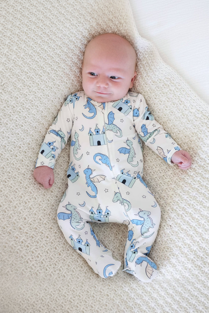 Cozy meets adventurous in our Dragon Adventure Zipper Footie! Covered in playful dragons, castles, moons, and stars in cool shades of blue and mint, this one-piece is made for both sleep and play. Crafted from soft, breathable bamboo viscose, it stretches for all-day comfort while a two-way zipper makes changes quick and easy. Smaller sizes include fold-over mitts to keep little hands warm and scratch free, and the built-in footies keep tiny toes snug. Practical and imaginative, this footie is perfect for everyday wear, sweet dreams and storytime snuggles.