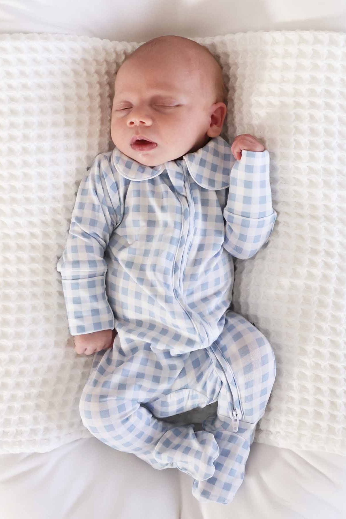 Peter Pan Collar Zipper Footie | Dusty Blue Gingham