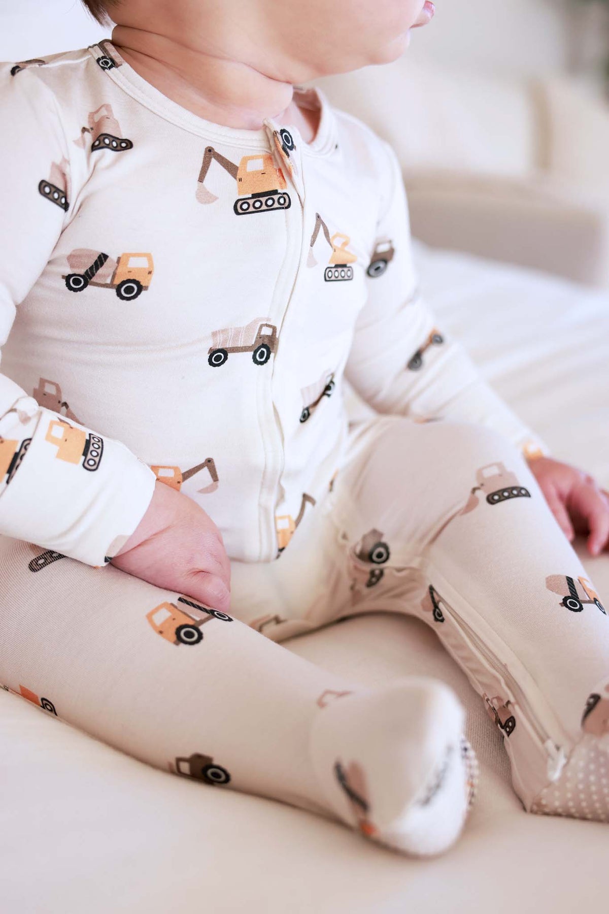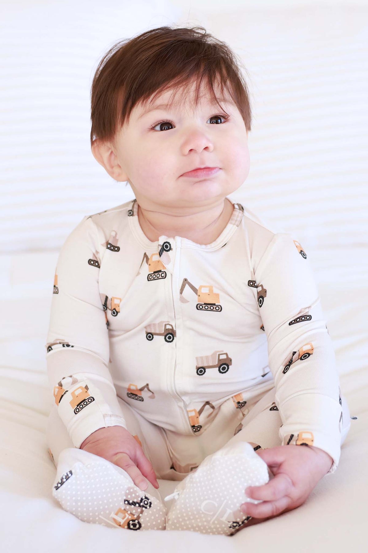 sitting baby boy wearing neutral construction bamboo zipper footie