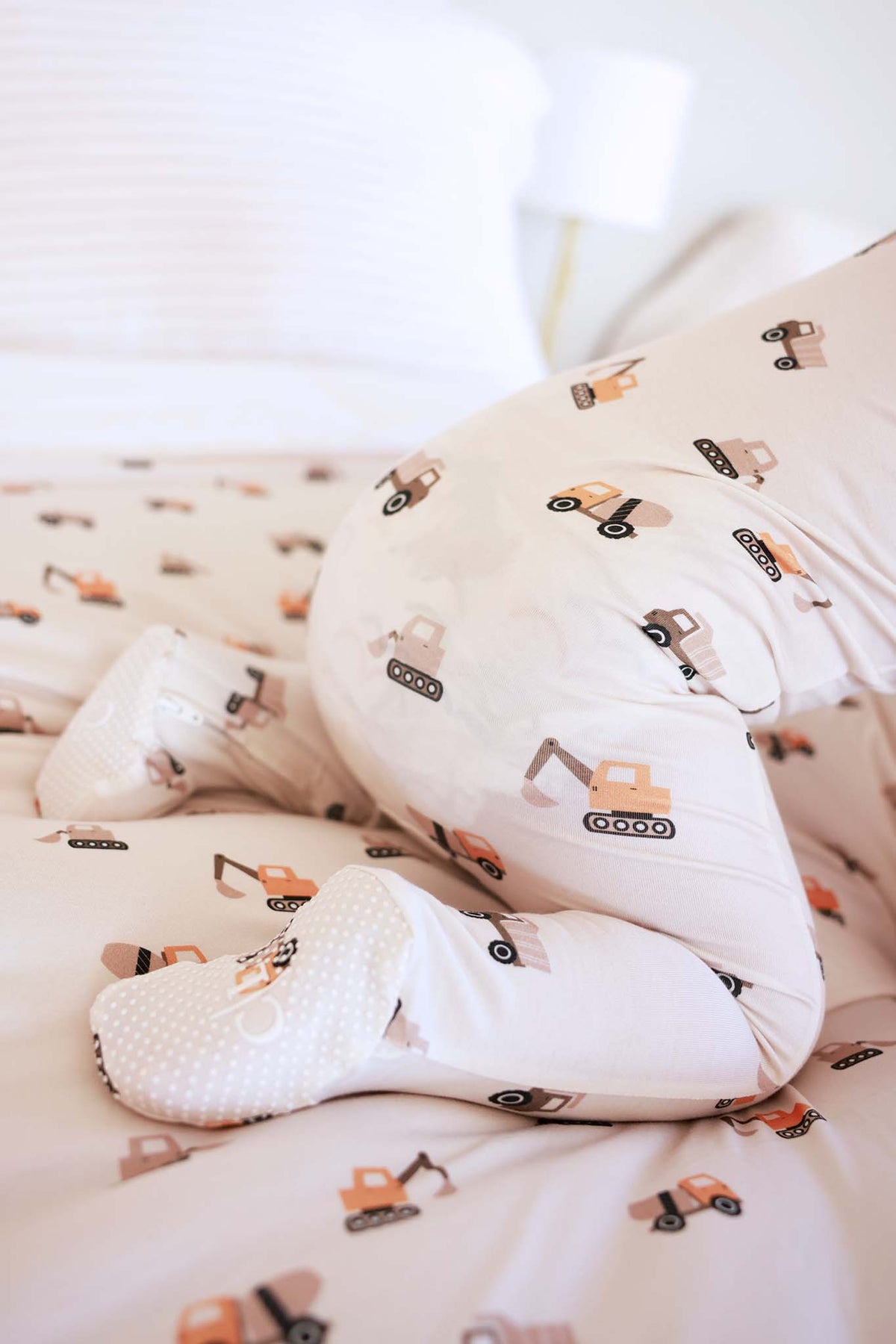 Little explorers will be ready for cozy adventures in the Little Builder Zipper Footie! This playful print features excavators, cement mixers, and more scattered across a soft neutral background that's perfect for little ones who love construction. Made from silky smooth bamboo fabric, this footie feels gentle against delicate skin while offering breathable comfort for day and night. The full-length zipper makes outfit and diaper changes quick and easy, while the snug fit keeps little movers comfortable whether they’re crawling, playing, or drifting off to sleep.