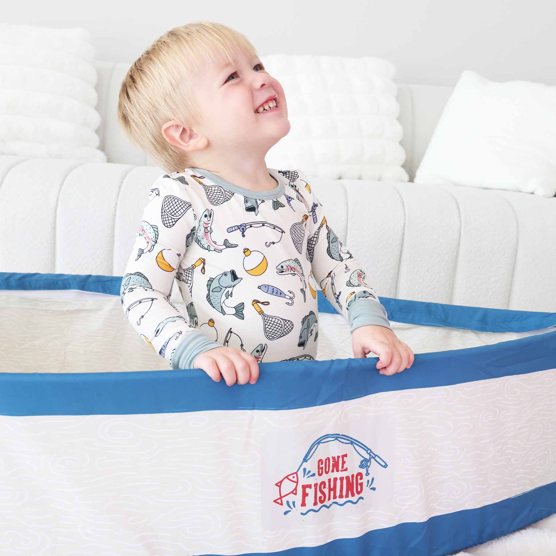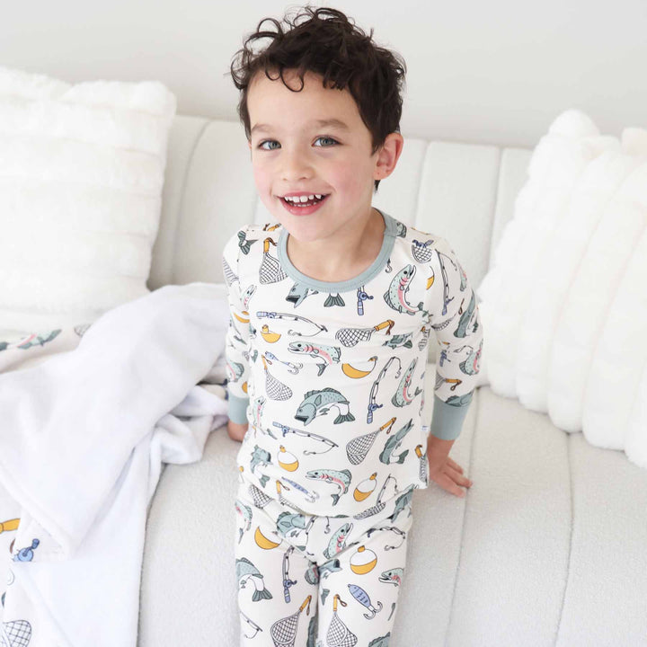 Reel in sweet dreams and cozy nights with our Catch of the Day Two-Piece Pajama Set! Made from luxuriously soft and breathable bamboo viscose, this adorable kids’ pajama set is perfect for little anglers who love all things fishing. Featuring playful bass, bobbers, fishing gear, and lakeside vibes, this set brings outdoor fun straight to bedtime. The set includes a comfy long-sleeve top and matching pants with an elastic waistband for a snug, stretchy fit. Bamboo viscose is naturally temperature-regulating, hypoallergenic, and buttery soft—making it ideal for sensitive skin and keeping your child cool in the summer and warm in the winter. Whether your little one is cuddling up after a day by the lake or lounging around the house, these pajamas are designed to keep them comfy from dusk till dawn. Whether they’re dreaming of casting lines or catching bass, your little one will drift off in ultimate comfort with our Catch of the Day Two-Piece Pajama Set.