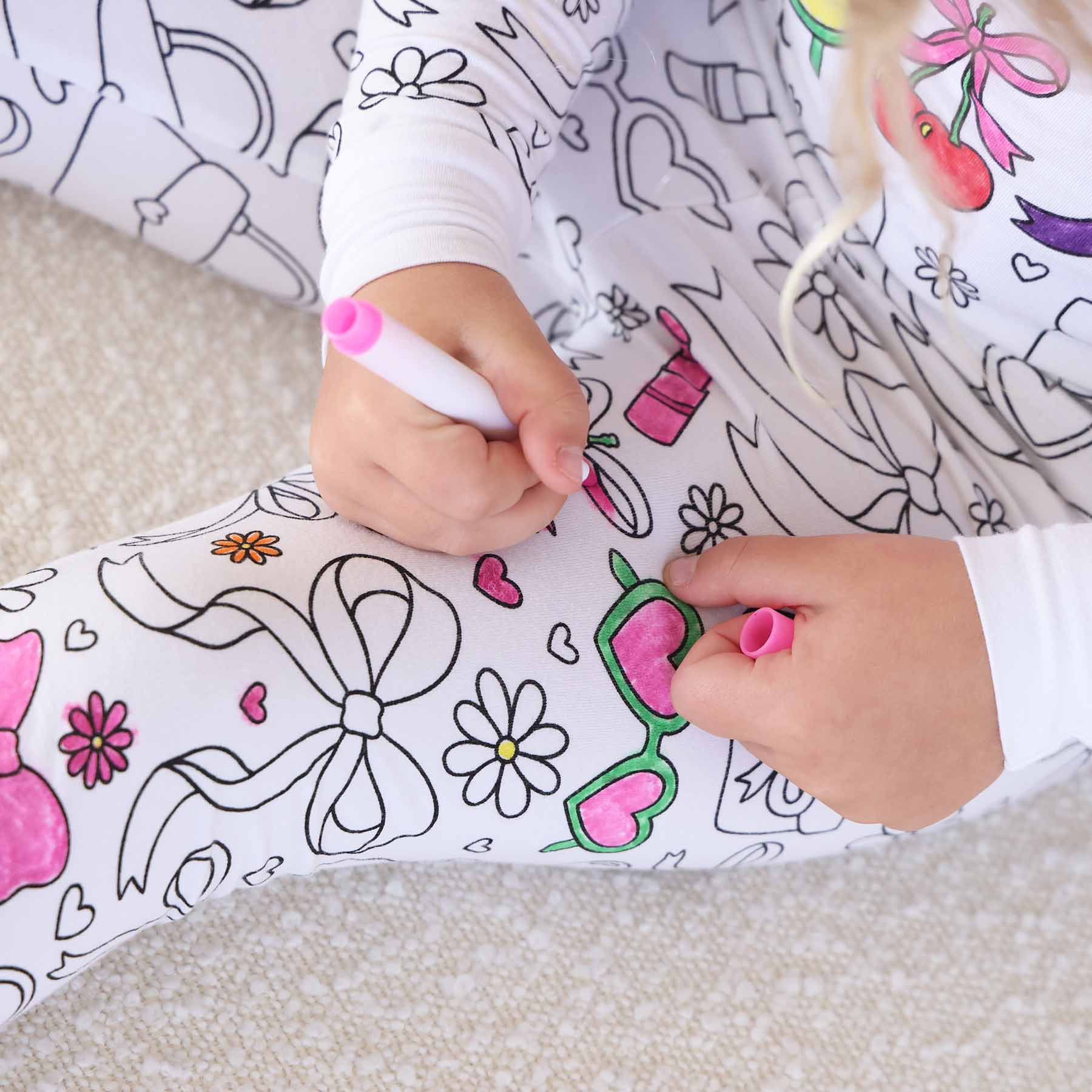 Our Material Girl Two-Piece Pajama Set brings style and creativity together in the coziest way. Covered in line-drawn bows, hearts, handbags, and other girly icons, this set is just waiting for little fashionistas to add their own colorful touch with fabric markers. Made from buttery-soft bamboo fabric, these pajamas are breathable, stretchy, and perfect for both sleep and play. The snug-fit design keeps them comfortable all night while giving plenty of room to move during daytime adventures. Whether worn in black and white or colored to perfection, these PJs make bedtime feel like a fashion show.