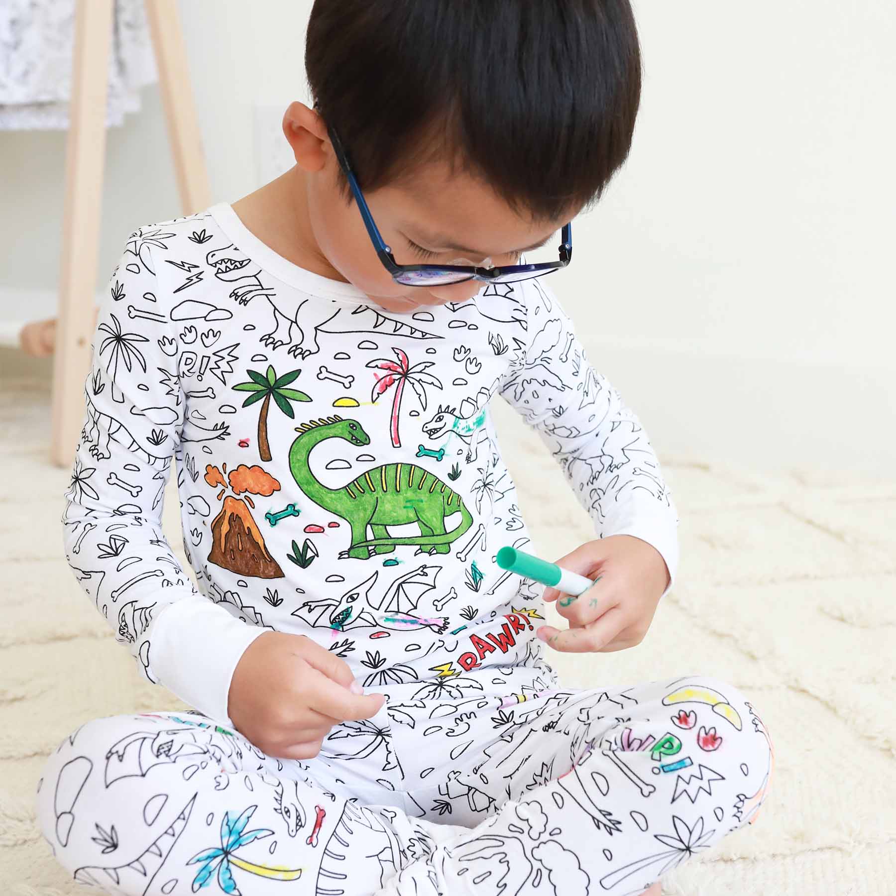 boy coloring the Jurassic Playground Colorable Pajama Two Piece Set