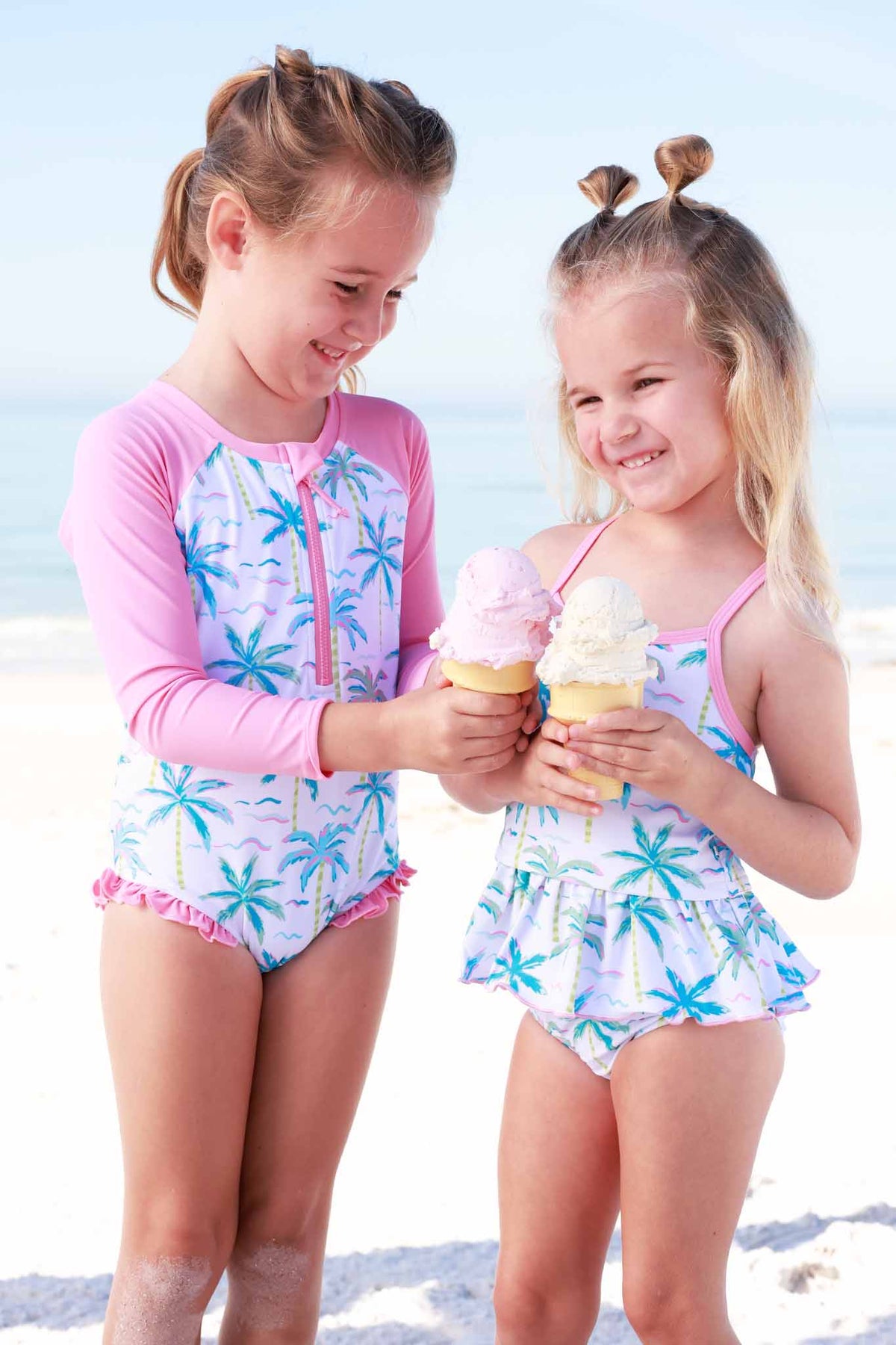 The Blue Lagoon Long Sleeve Rash Guard with Front Zipper features vibrant teal palm trees that bring a tropical touch to every swim day! It’s the perfect blend of bold style and practical design for active little ones. The long sleeves provide added coverage for sunny adventures, while the front zipper makes changing quick and fuss-free. Whether it’s heading from the beach to lunch or rinsing off after swim lessons, this thoughtful detail makes all the difference. Crafted in soft, stretchy swim fabric that moves comfortably with every splash and sprint, it’s designed for wave chasing, sand digging, and memory-making under sunny skies!