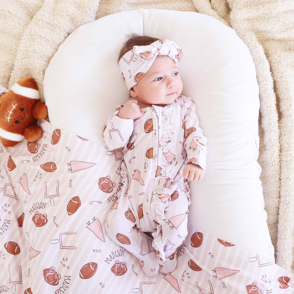 Tiny Touchdowns Ruffle Zipper Footie | Pink