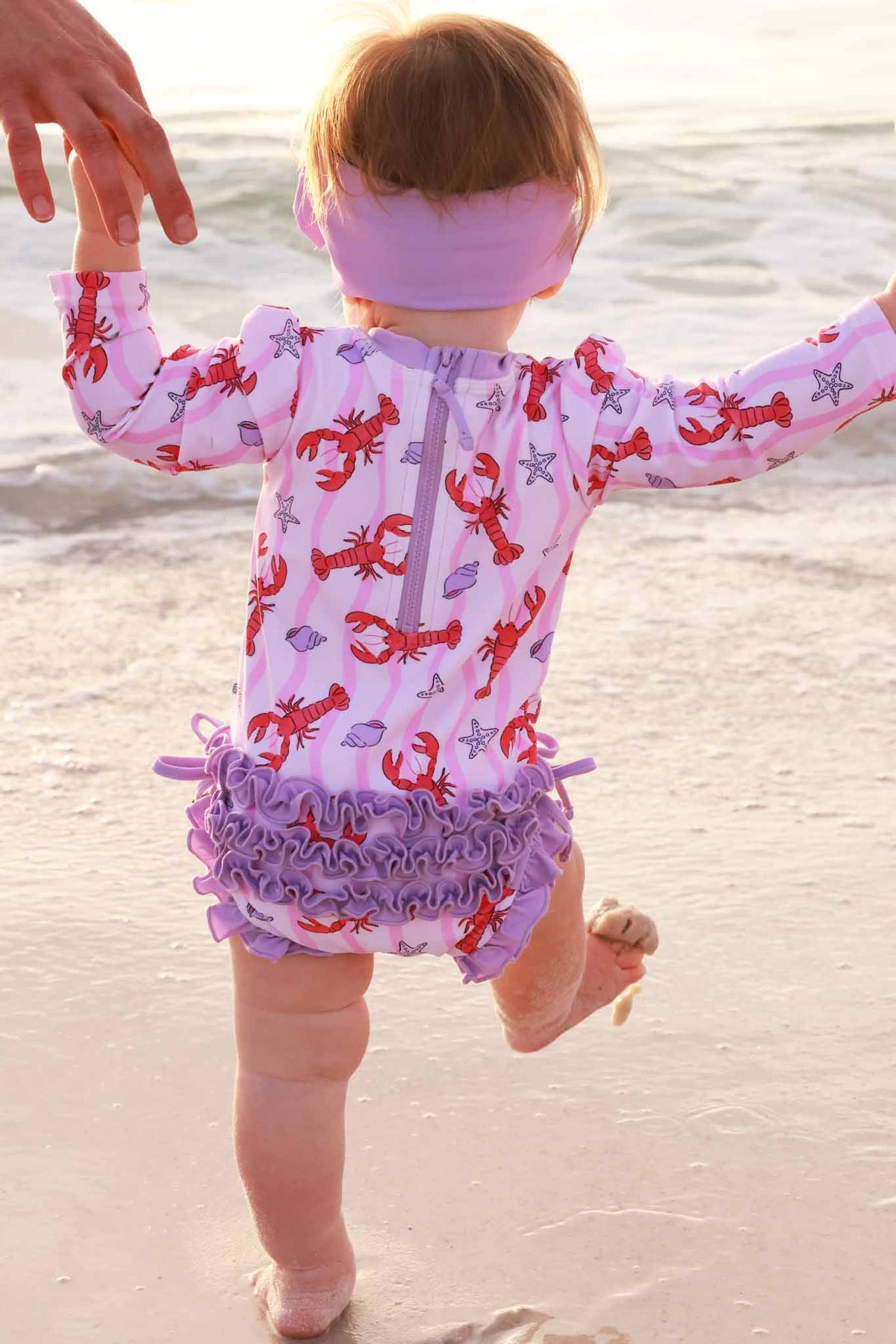 baby girl walking on the beach in long sleeve rash guard swimsuit with ruffle bottom in pinch me lobster print wearing a matching light pink swim bow