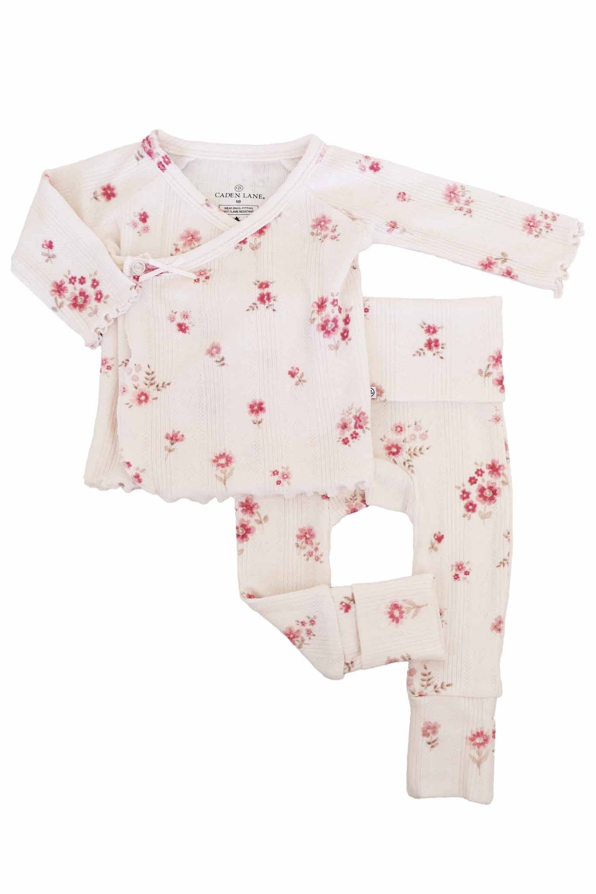 Sweet, cozy, and thoughtfully designed, our Precious Posies Pointelle Crossover Set is perfect for those early days with your little one. Featuring soft scattered florals in gentle pink tones and a delicate pointelle texture, this set brings a classic, comforting feel to your baby’s everyday wardrobe. The crossover style makes dressing easier and more comfortable, while the lightweight pointelle fabric feels soft and breathable against your baby’s skin. Ideal for naps, cuddles, and quiet days at home, this set is as practical as it is beautiful.