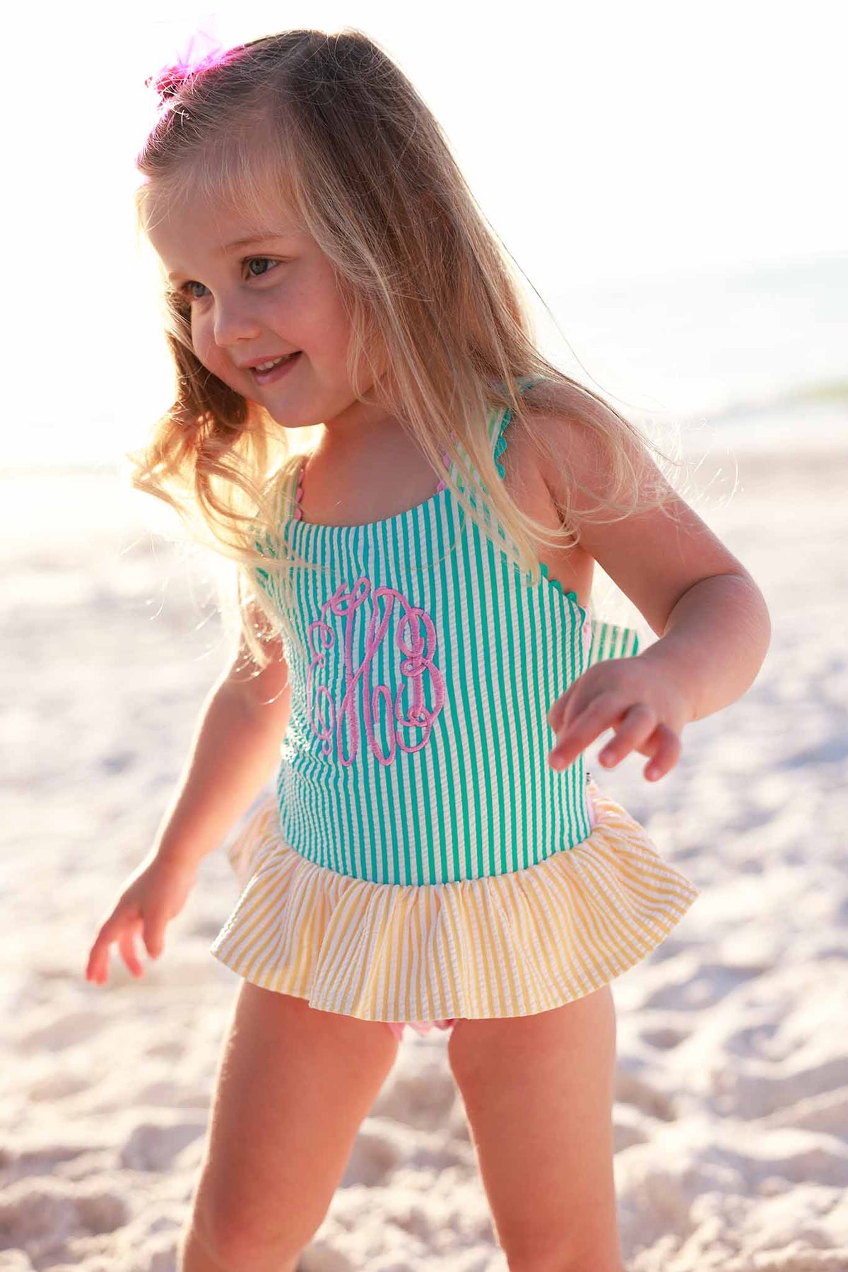 girl walking on the beach in multicolor seersucker one piece swimsuit with monogram