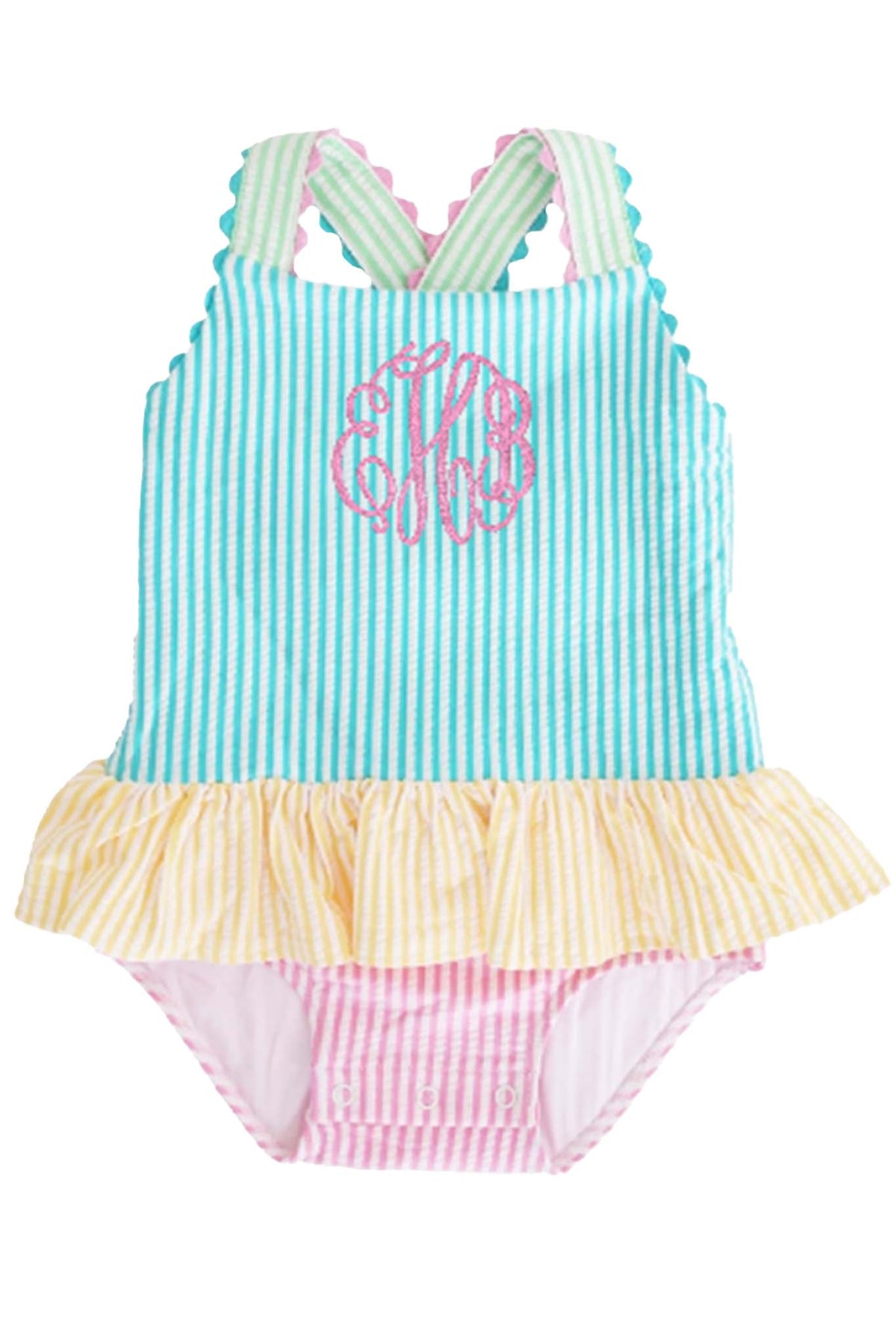 multicolor seersucker one piece with skirt and script embroidery monogram