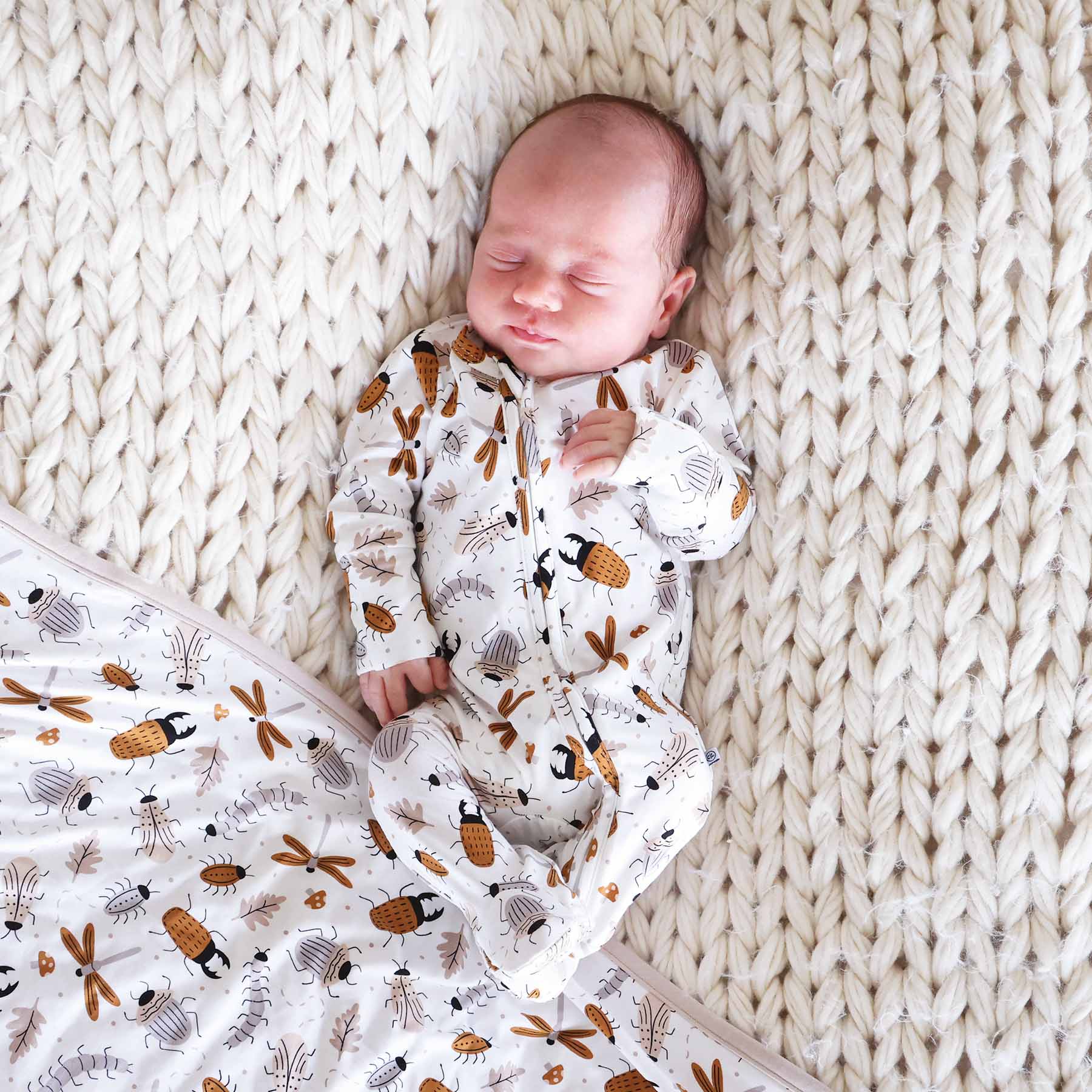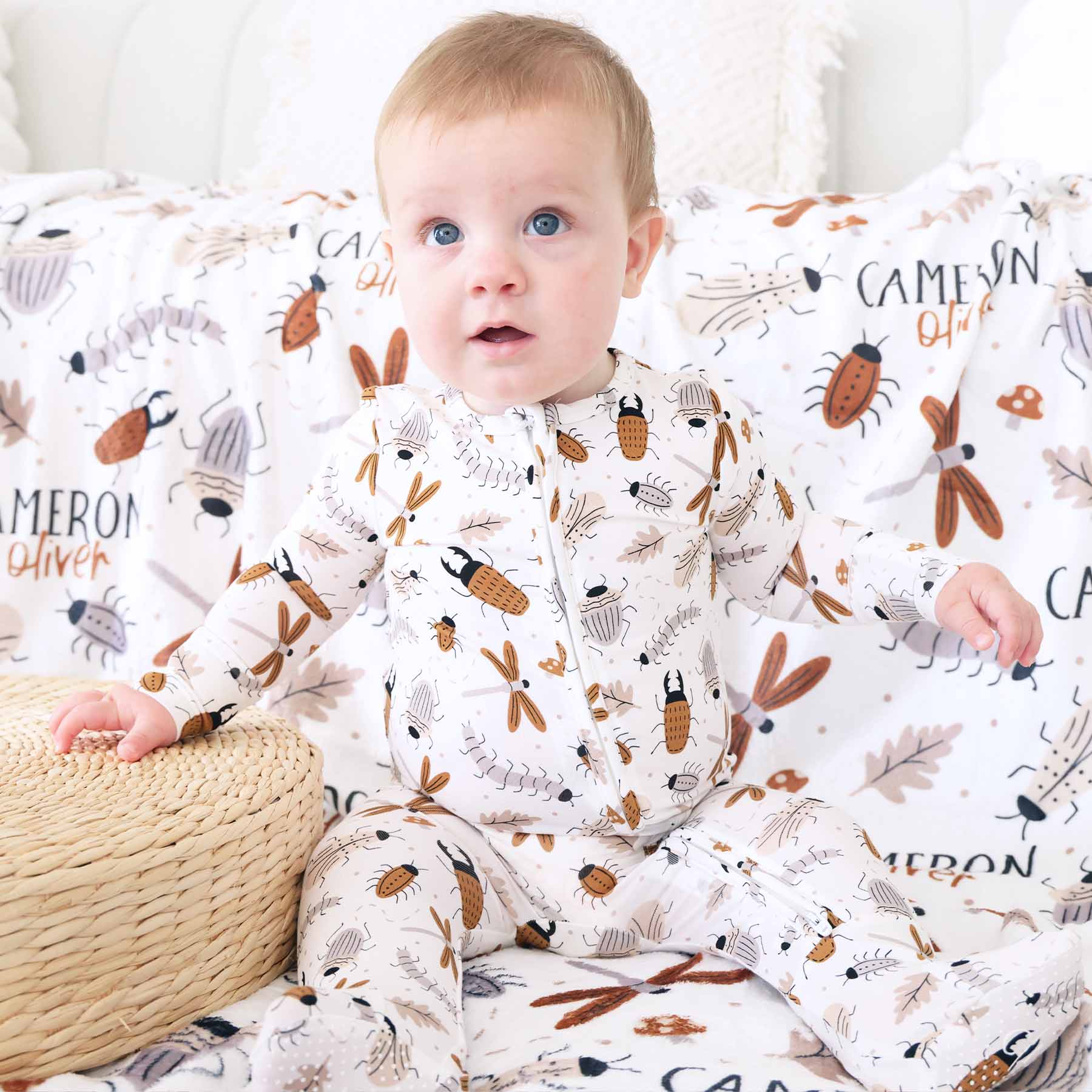 Crawl into coziness with our Snuggle Bug Zipper Footie, a soft and snuggly one-piece designed for your littlest love bug! Featuring an adorable mix of beetles, dragonflies, caterpillars, and tiny mushrooms scattered across a warm white background, this playful print is perfect for tiny explorers with a love for all things cute and crawly. Made from our buttery-soft bamboo blend, itâs breathable, stretchy, and gentle on babyâs delicate skin. The two-way zipper makes changes a breeze, and fold-over mittens on smaller sizes keep tiny hands warm and scratch-free. Whether itâs bedtime, playtime, or buggy snuggles on the go, this footie is made for comfort and crawling in style.
