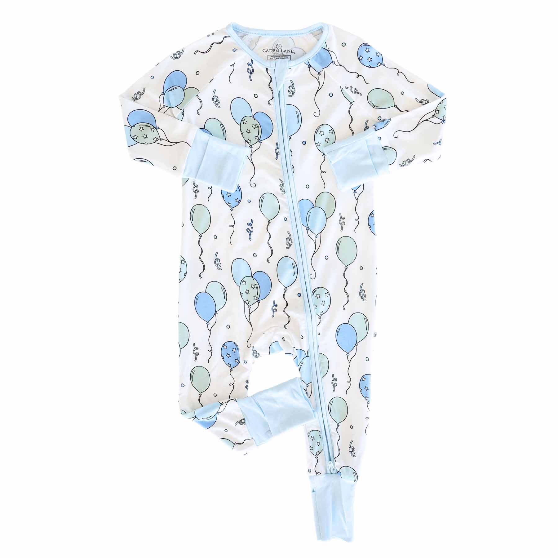 blue balloon and streamer convertible zip romper pajama for babies and toddlers