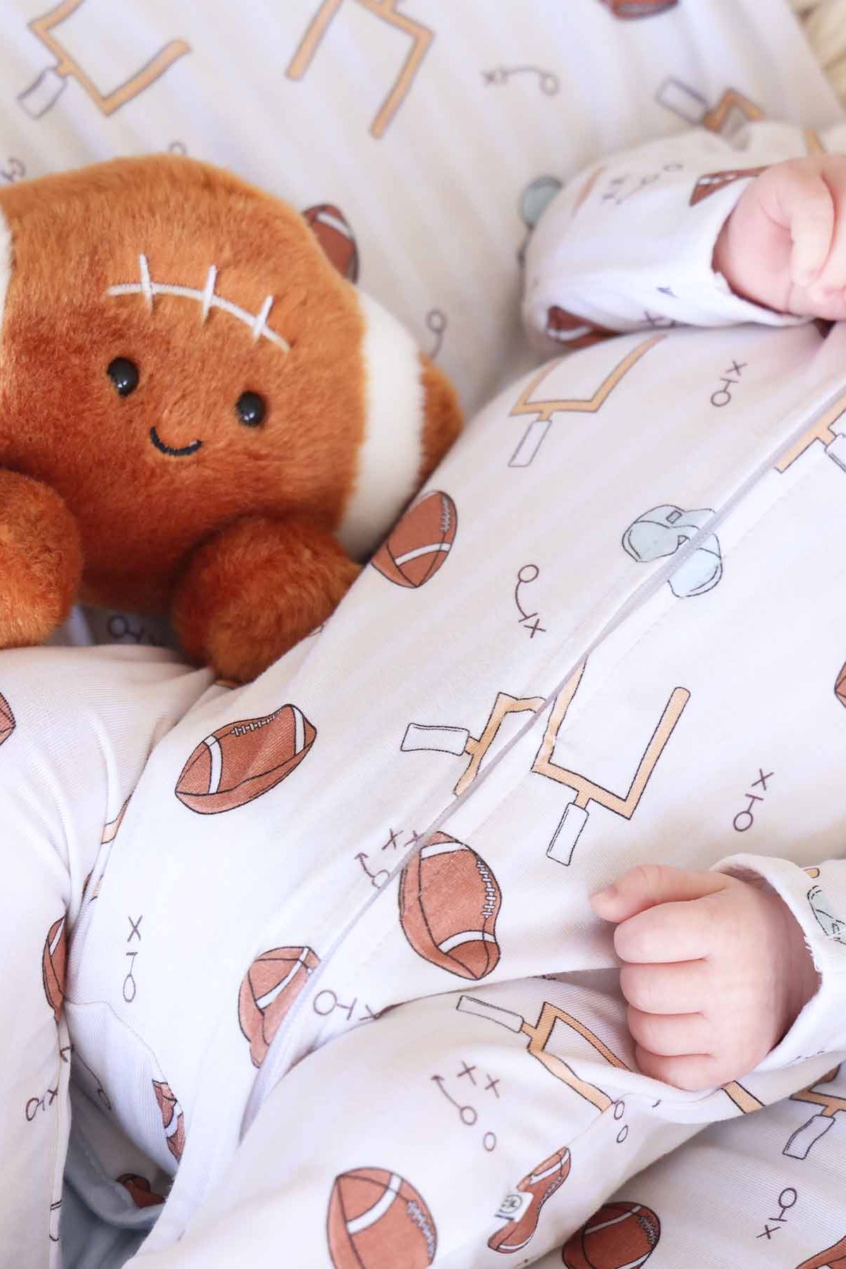 For your tiniest MVP, the Tiny Touchdowns Zipper Footie brings cozy comfort to every huddle and naptime. Covered in footballs, goal posts and sketched play arrows, this print with light tan stripes is perfect for little ones who were born ready for game day. Made from a breathable bamboo blend that’s gentle on sensitive skin, this footie features a two-way zipper for easy changes and fold-over mittens to keep little hands warm. Whether they’re snoozing on the sidelines or gearing up for kickoff, it’s a win for style and comfort.