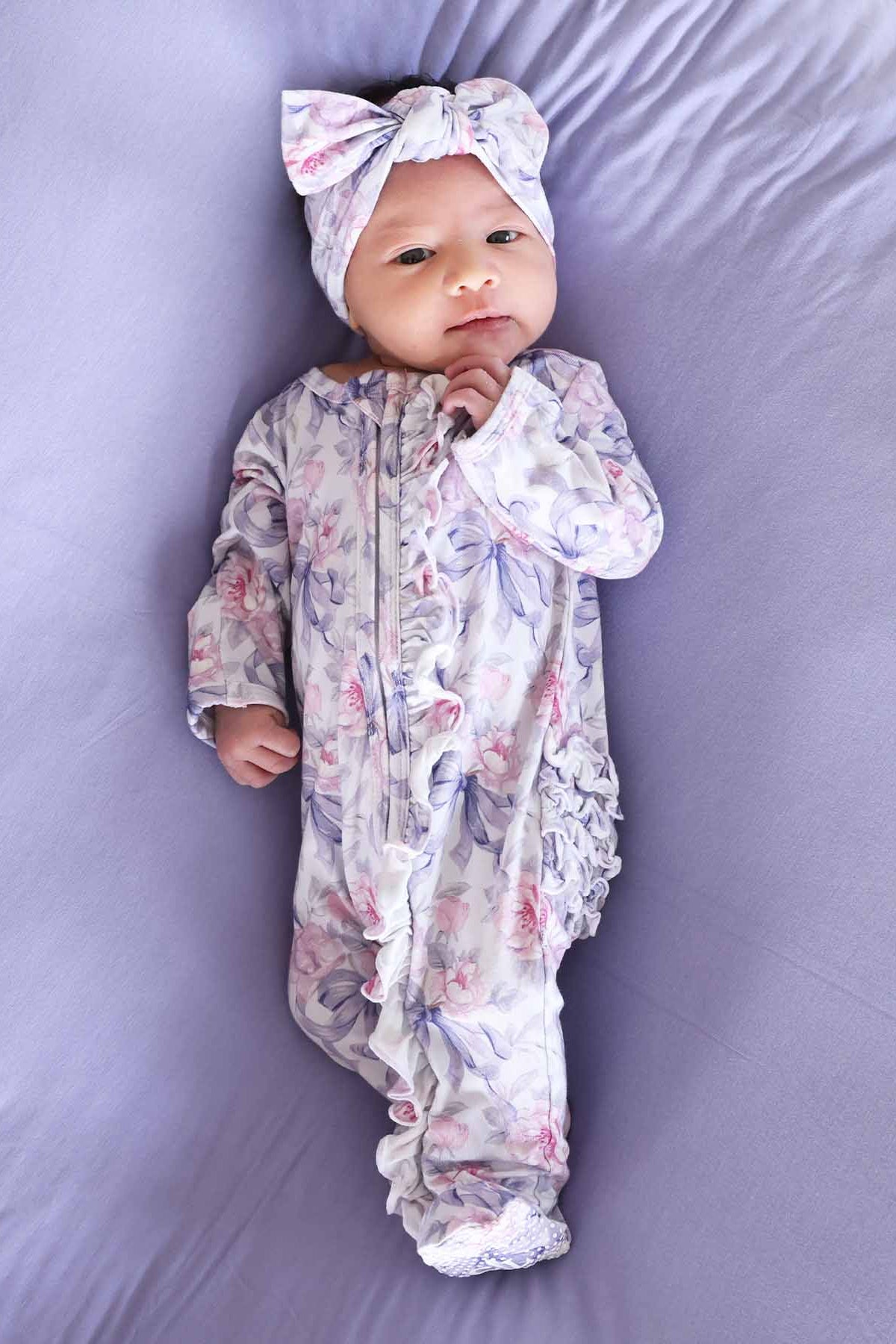 Bedtime gets a floral upgrade with our Leighton’s Lavender Ruffle Zipper Footie! Designed just for little girls who love a touch of sweetness, this cozy one-piece features soft watercolor roses and dainty lilac bows on a dreamy lavender background. The ruffle details along the zipper and bottom add an extra dose of charm to every snuggle. Made from an ultra-soft bamboo blend, it’s breathable, stretchy, and perfect for wiggly sleepers and cozy cuddles. A two-way zipper makes diaper changes quick and easy, and fold-over mittens on smaller sizes help keep tiny hands warm and scratch-free. From crib cuddles to morning giggles, this pajama is made for softness, style, and all the sweet moments in between.