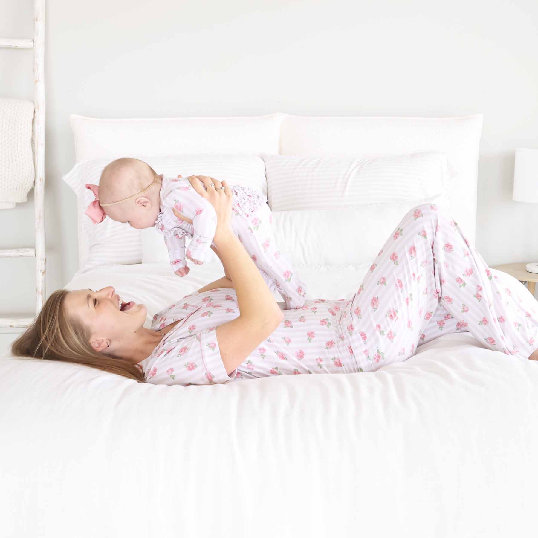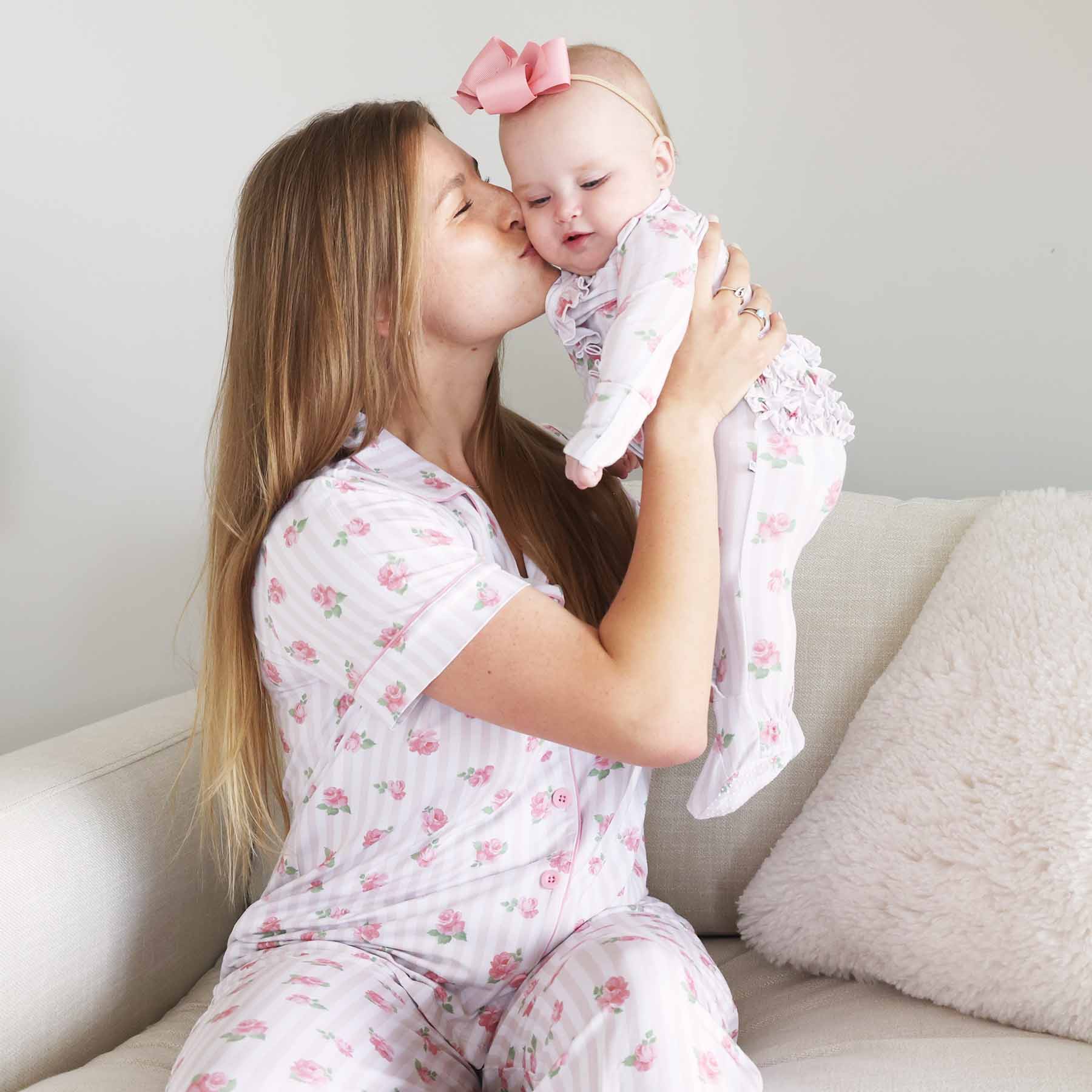 Wrap yourself in timeless charm with our Rosy & Cozy women’s lounge set! Featuring a collared button-up top and flowy flared pants, this two-piece set is made from buttery-soft bamboo viscose with delicate light pink stripes with sweet scattered roses. Perfect for slow mornings, couch cuddles, and matching moments with your littles, this set feels as beautiful as it looks. The breathable, stretchy fabric keeps you comfy all day, and the functional buttons make it nursing-friendly, too. Whether you're cuddling up at home or twinning with your mini, this is the kind of cozy that never goes out of style.