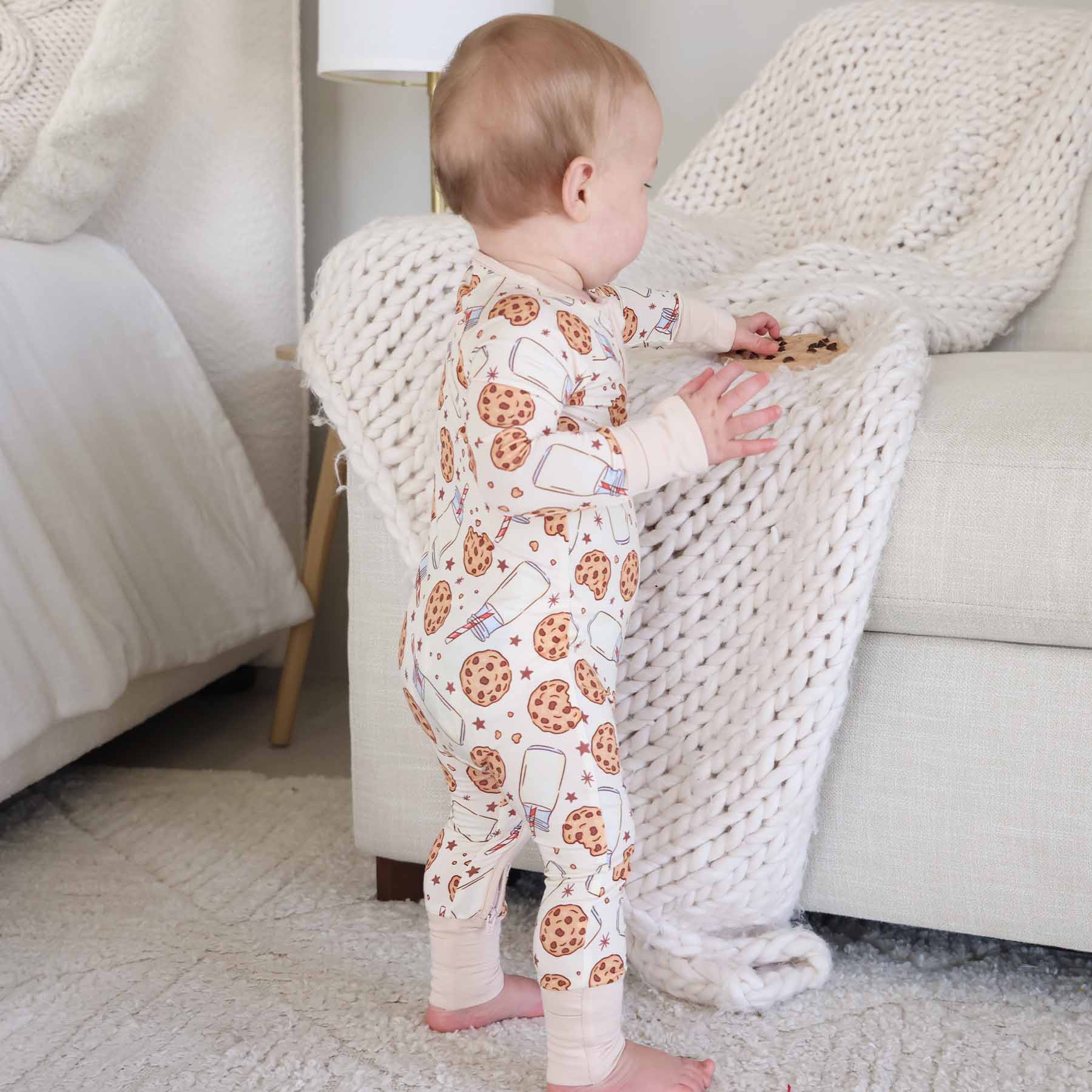 Snuggle up in the sweetness of the Cookie Cuddles Convertible Zip Romper! Decorated with chocolate chip cookies, milk bottles, and cheerful stars, this print is made for cozy nights and playful mornings. Crafted from buttery-soft bamboo viscose, it’s breathable, stretchy, and gentle on delicate skin. The convertible design lets you switch between footless and footed in seconds, while a two-way zipper makes changes quick and easy. It’s the perfect piece for comfort that’s as sweet as milk and cookies!