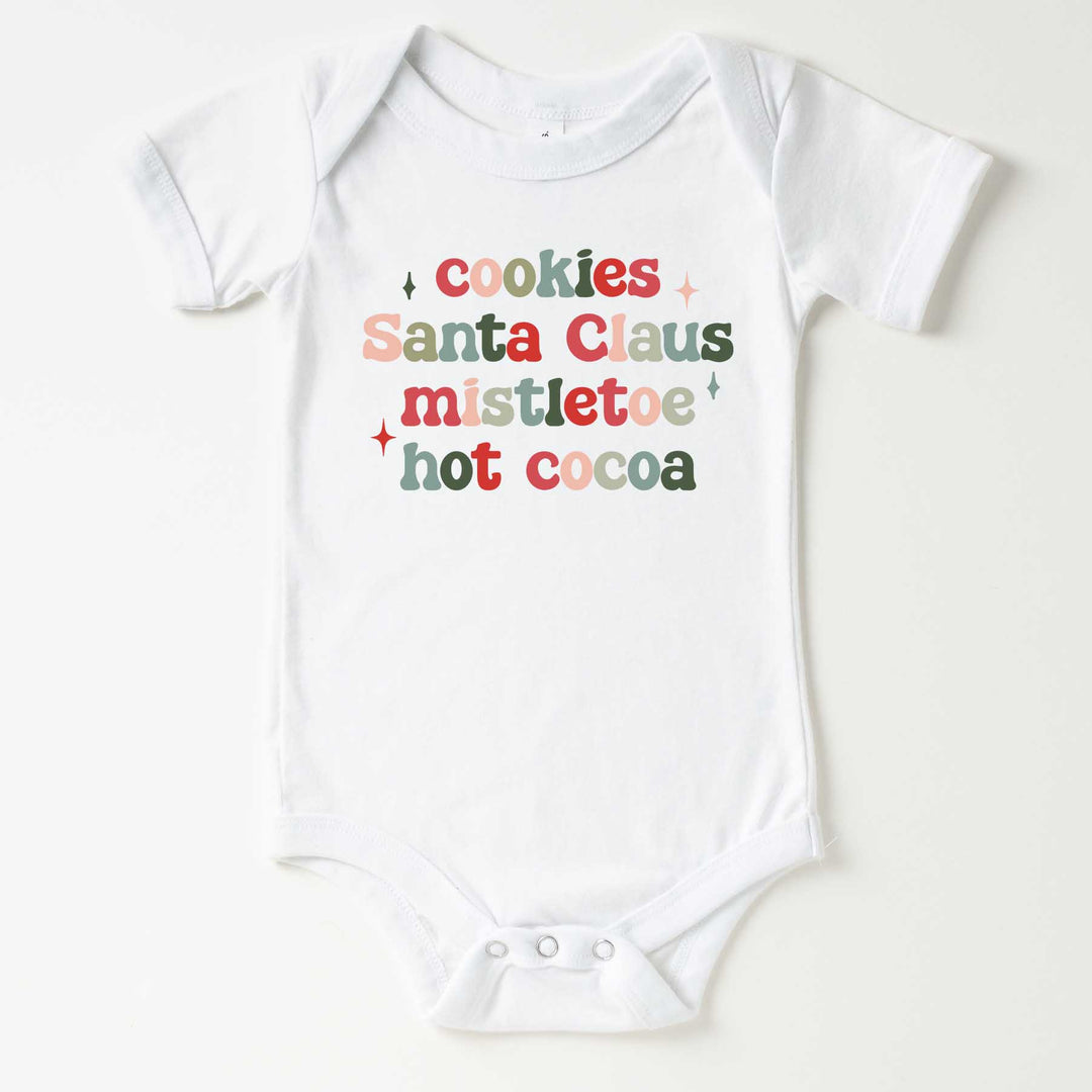Get your little one ready for the comfiest Christmas yet with this festive graphic bodysuit! Featuring all of the holiday favorites - cookies, Santa Claus, mistletoe, and hot cocoa - this adorable bodysuit will wrap your baby in Christmas cheer. Made from super soft, breathable cotton, this bodysuit will keep your baby comfy all season long. Whether they’re snuggling up by the fire or meeting Santa for the first time, this bodysuit is the perfect holiday staple for your little bundle of joy. Celebrate the season in style with a look that’s as sweet as Christmas morning!