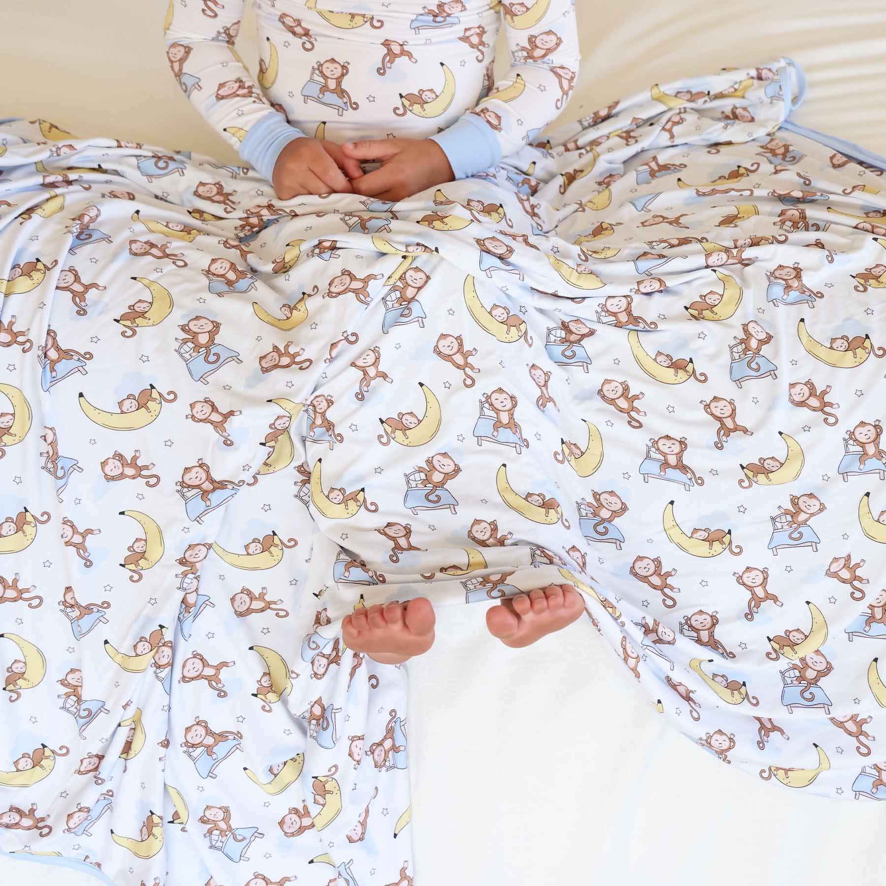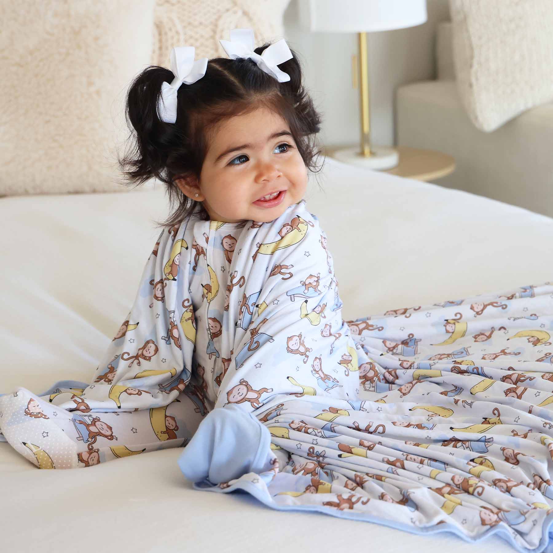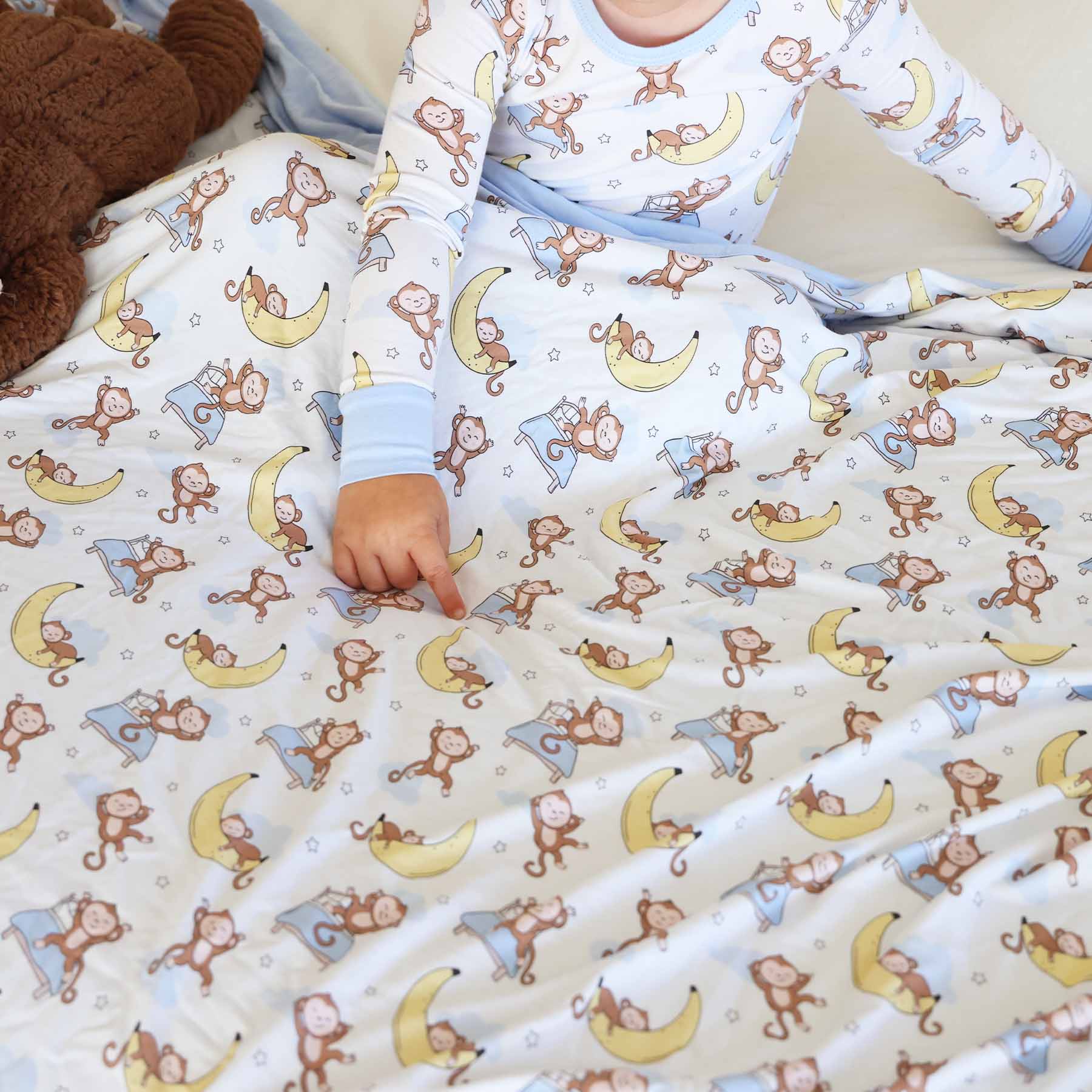Snuggle time gets a silly twist with our Monkey See, Monkey Snooze Double Sided Bamboo Blanket! One side features cheerful monkeys snoozing on bananas and cuddling up for bed, while the reverse is a soft coordinating solid blue for an extra touch of calm. Made from two layers of our signature bamboo fabric, this blanket is silky smooth, breathable, and the perfect weight for year-round comfort. Whether they’re curling up for a nap or lounging on the couch, this blanket is sure to be a bedtime favorite your little one will go bananas for!