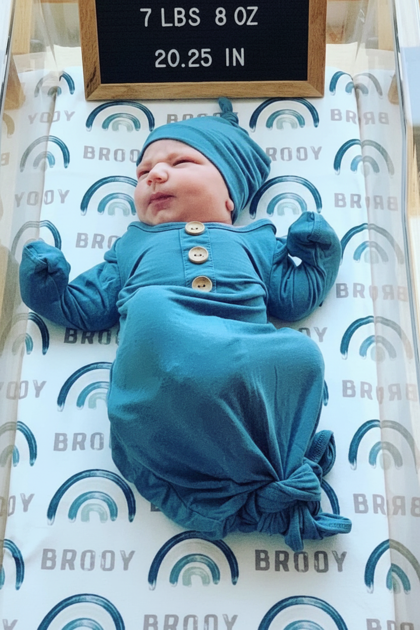 The sweetest shade of dusty blue, and the softest fabric you've EVER felt! These knotted gowns are crazy popular because it's so easy to change baby and keeps them nice and warm by simply knotting the bottom so their tiny legs are covered. These gowns are also gorgeous in newborn pictures. So simple and so comfy!