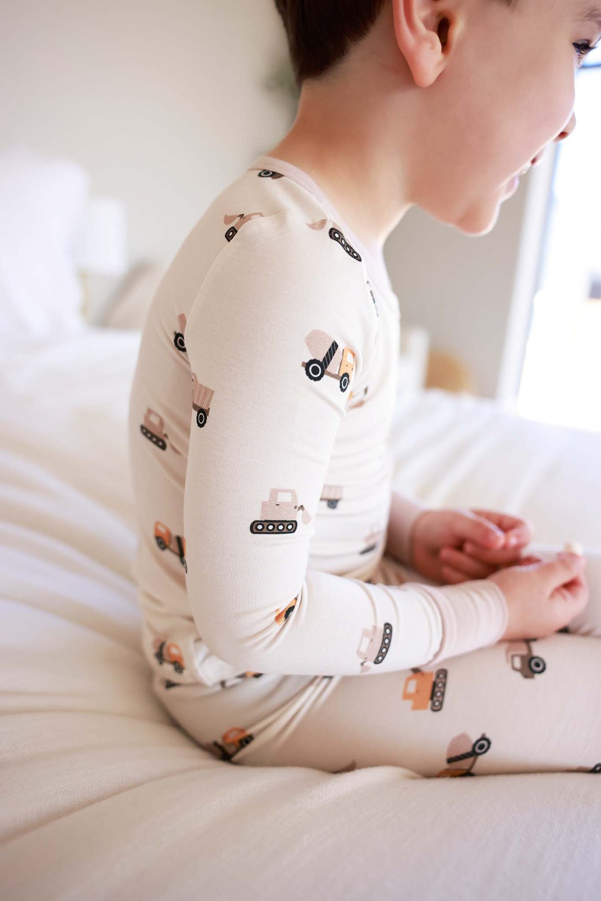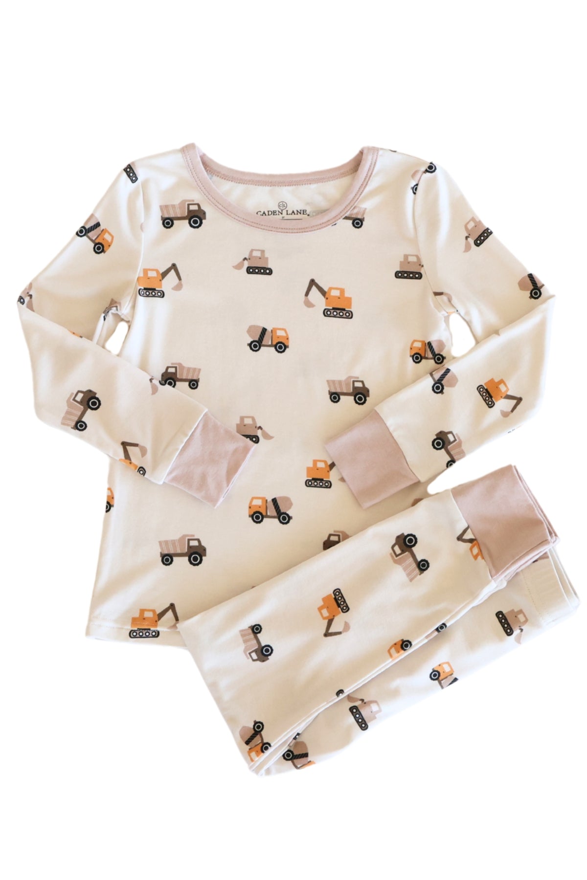Bedtime gets a playful upgrade with the Little Builder Two-Piece Pajama Set! This cheerful print features excavators, cement mixers, and more scattered across a soft neutral background in warm shades of golden yellow that's perfect for little ones who love busy building days. Crafted from buttery soft bamboo fabric, this pajama set feels lightweight, breathable, and gentle on sensitive skin. The long sleeve top pairs with matching pants designed with just the right amount of stretch for comfortable movement, whether they’re winding down with a bedtime story or getting just cozy.