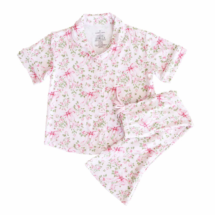 pink and green floral and bow two piece pajama lounge set for girls