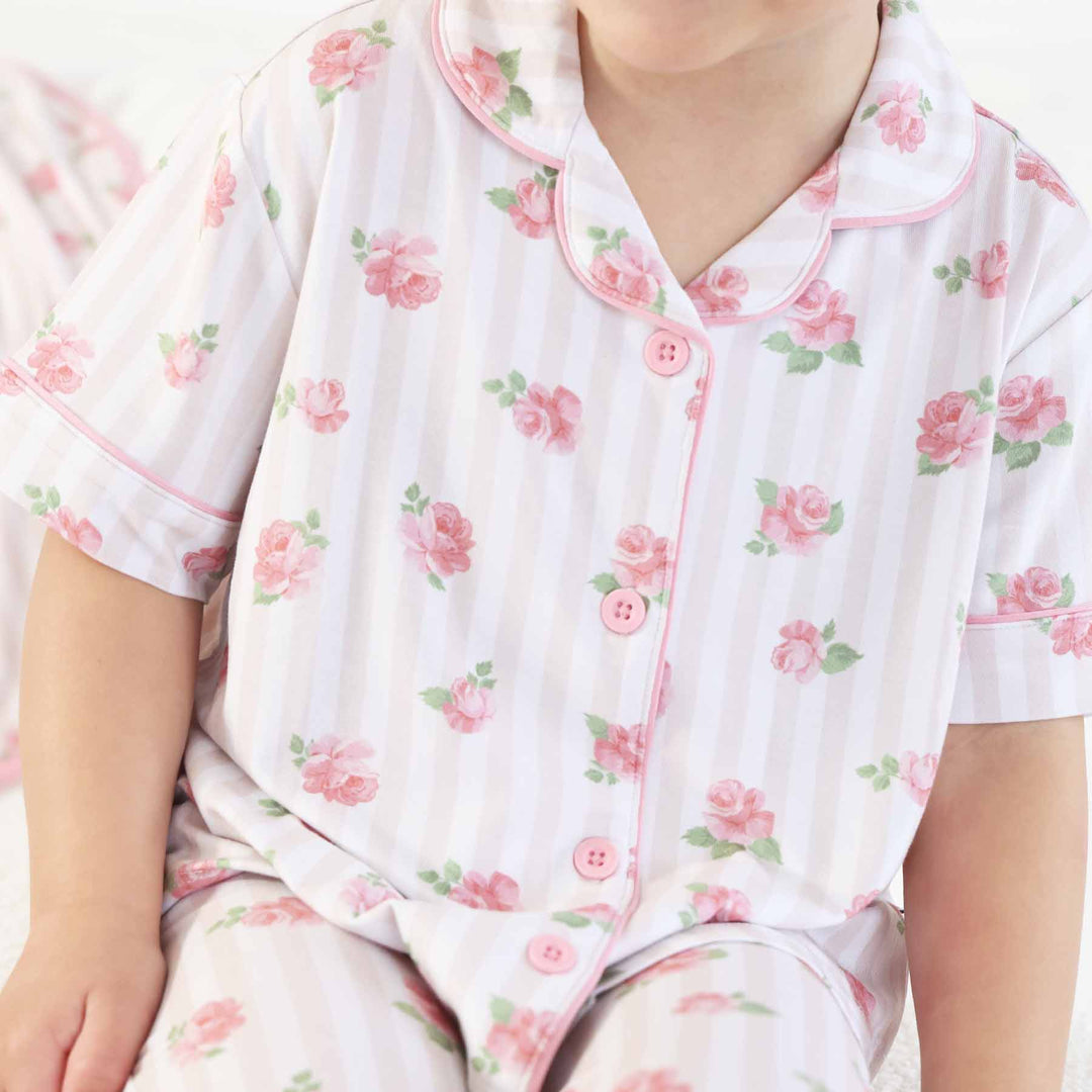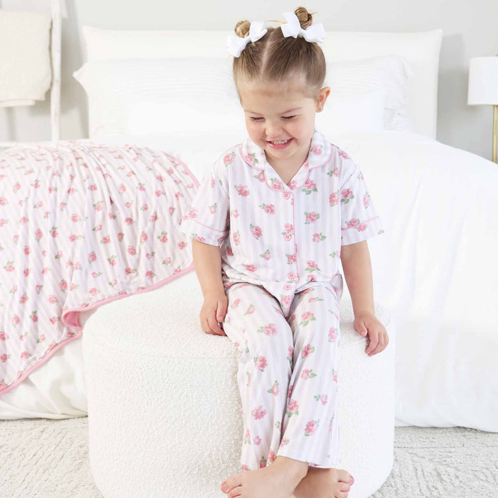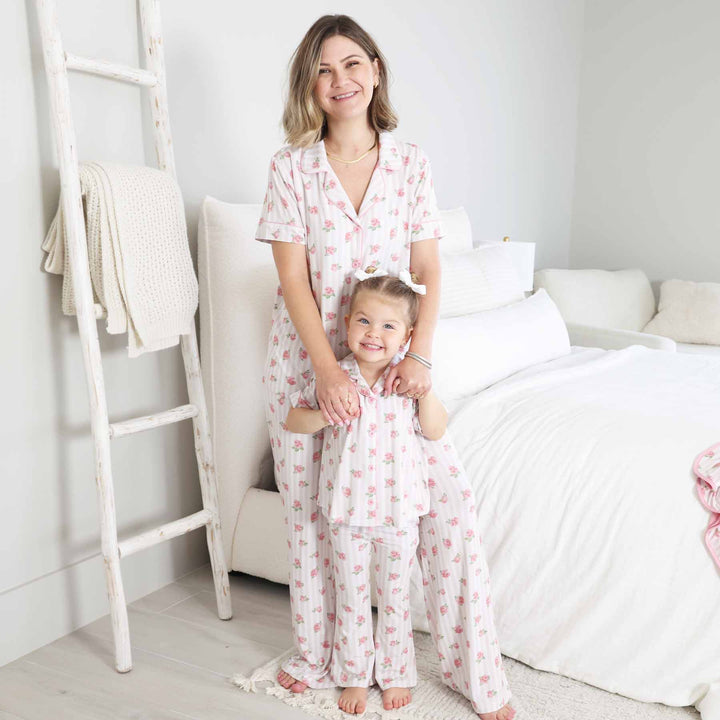 The sweetest matching moments start here! Our girls’ lounge set features a button-up, collared top and flared pants in a variety of prints, so there is something for every girl's style. It's the perfect mix of cozy and cute, and made to match with our women's lounge sets for picture-perfect moments. Made from soft and breathable bamboo viscose, this two-piece set is gentle on sensitive skin and comfy enough for slow mornings and couch snuggles. The relaxed fit and stretchy feel make it easy to wear all day. Pretty, practical, and perfect for girls who love to match with mom while staying oh-so-comfy!