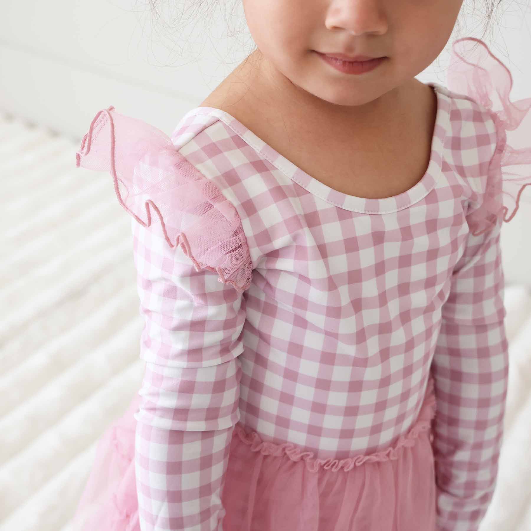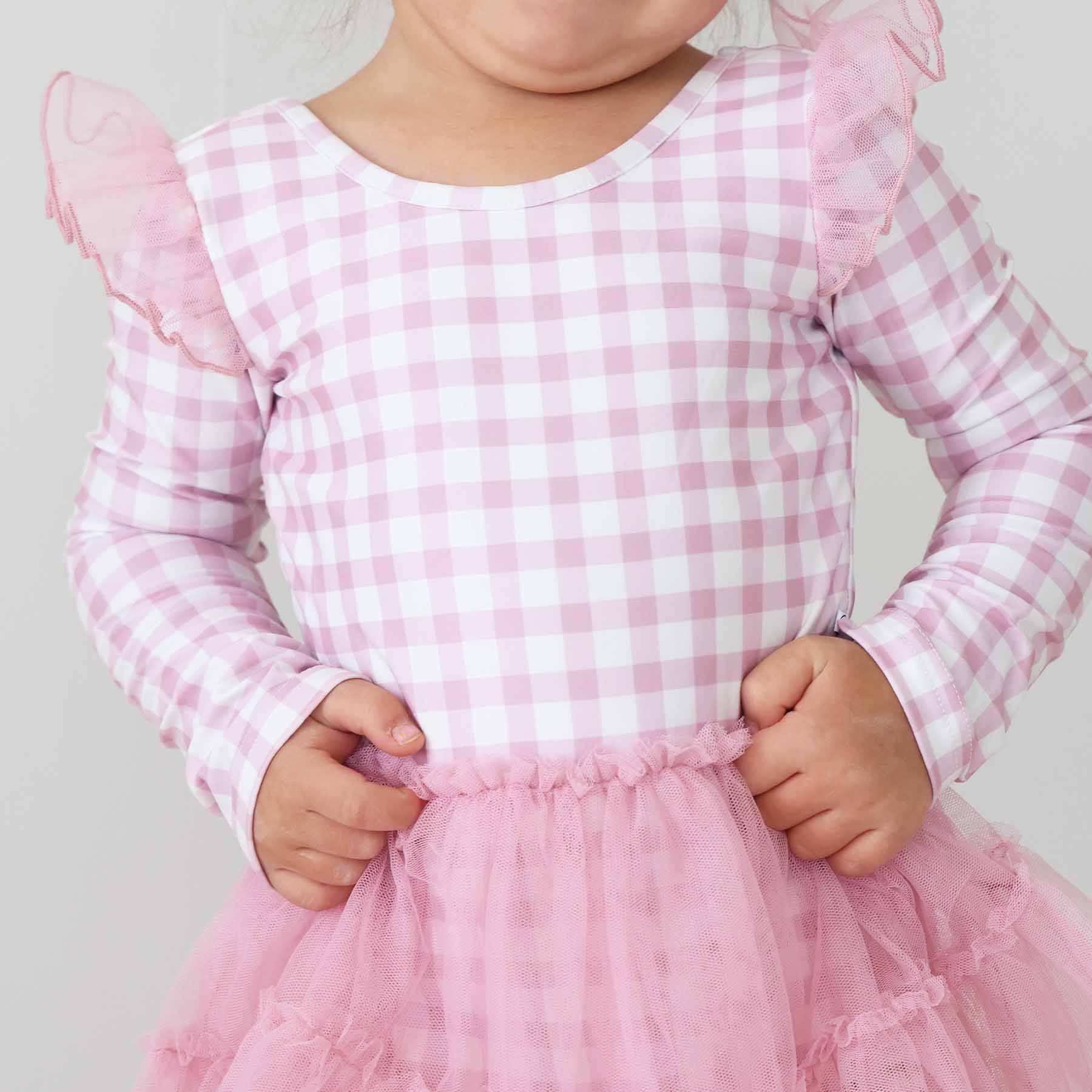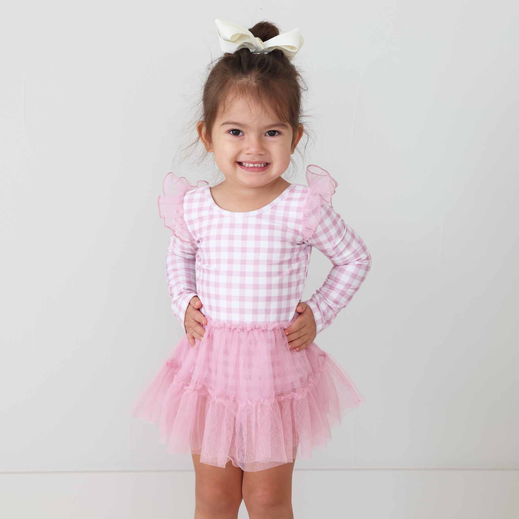 Oh-so-sweet and made to twirl, our Girly Gingham Long Sleeve Leotard was made for the tiniest ballerinas! The soft pink and white gingham pairs perfectly with a full pink tulle skirt, creating a look that’s playful and picture perfect. Delicate tulle shoulder ruffles add a touch of cuteness, while the soft, stretchy fabric keeps her comfortable for playtime, dance class, or dress-up days. The long sleeves make it ideal for cooler weather, while the snug fit ensures it stays perfectly in place through every spin and skip.