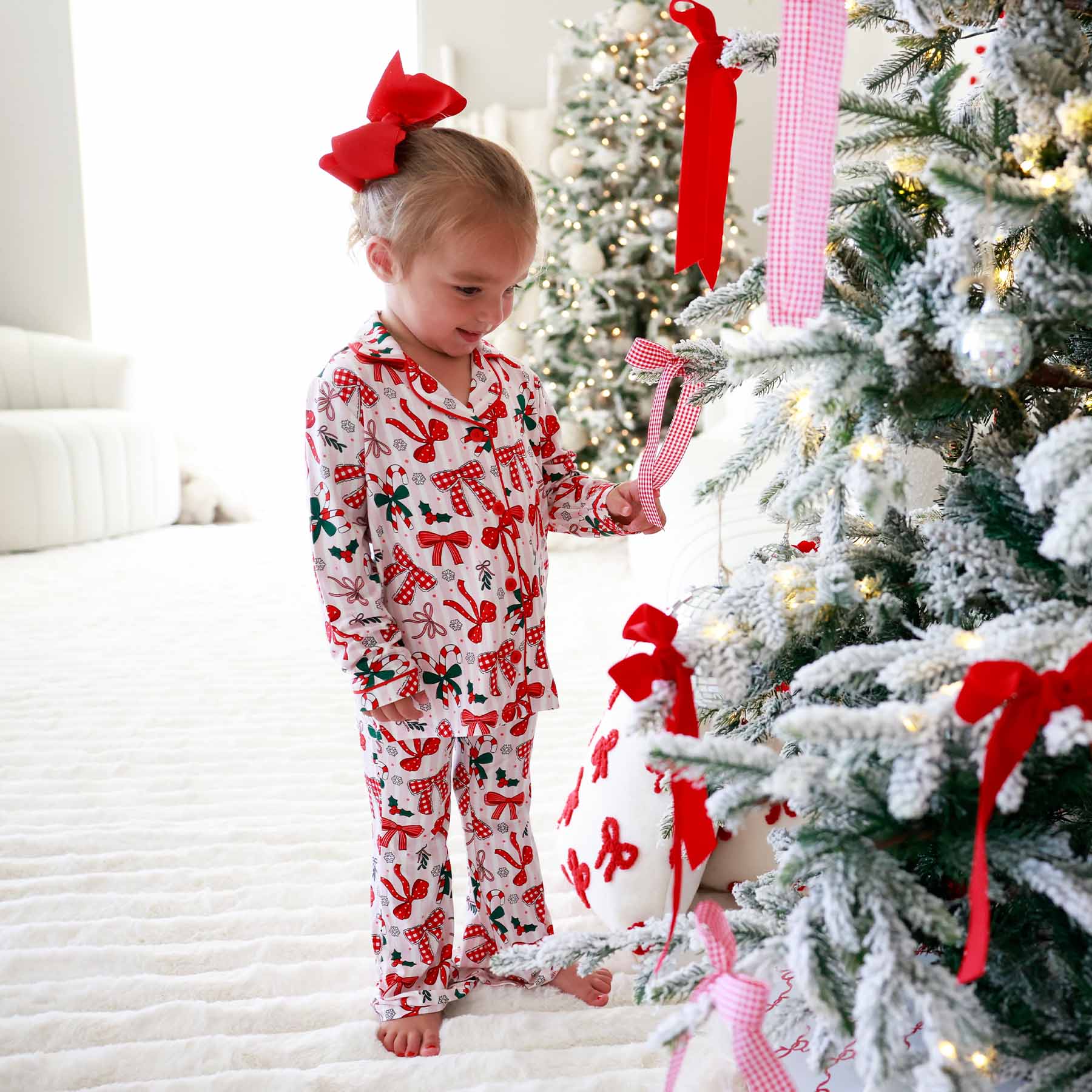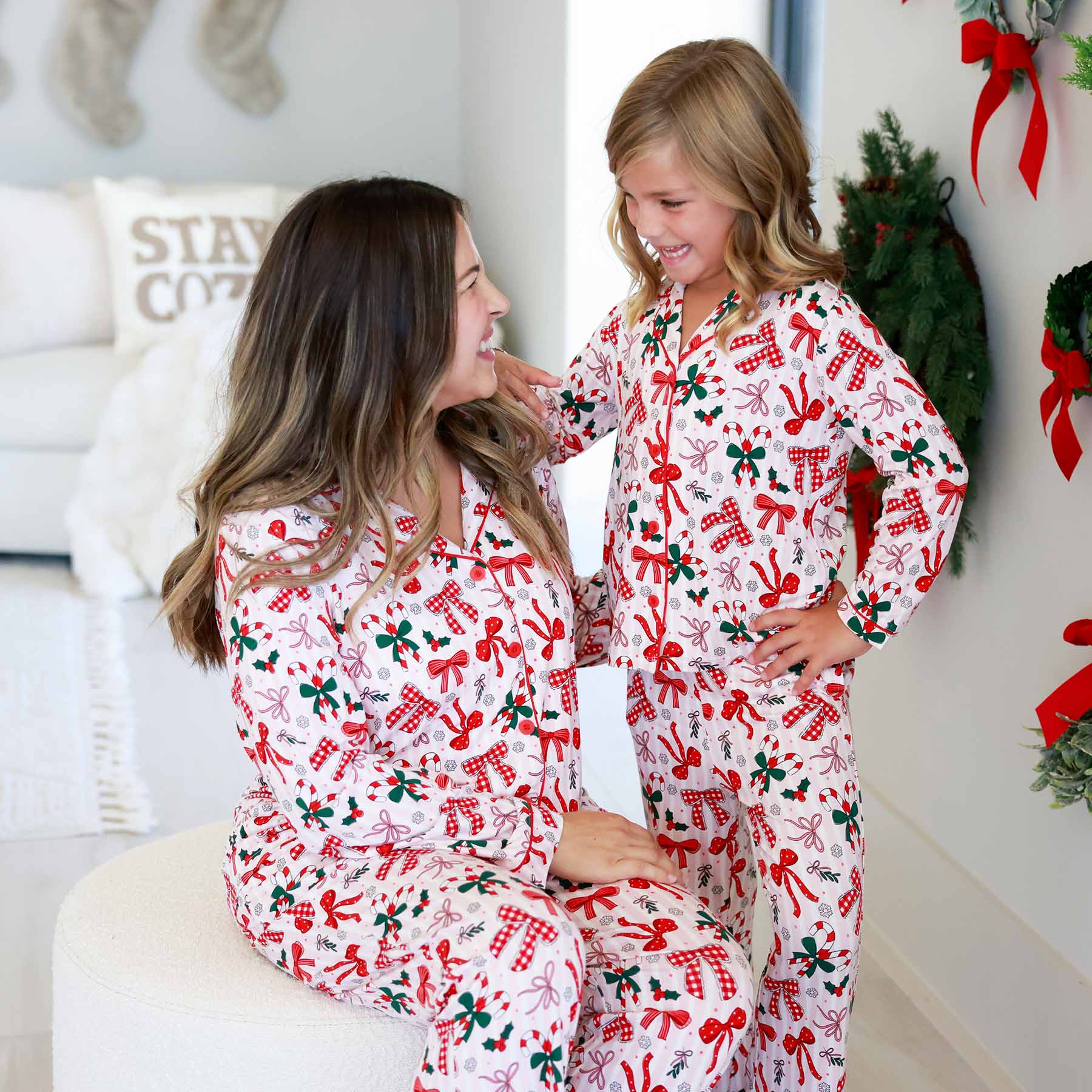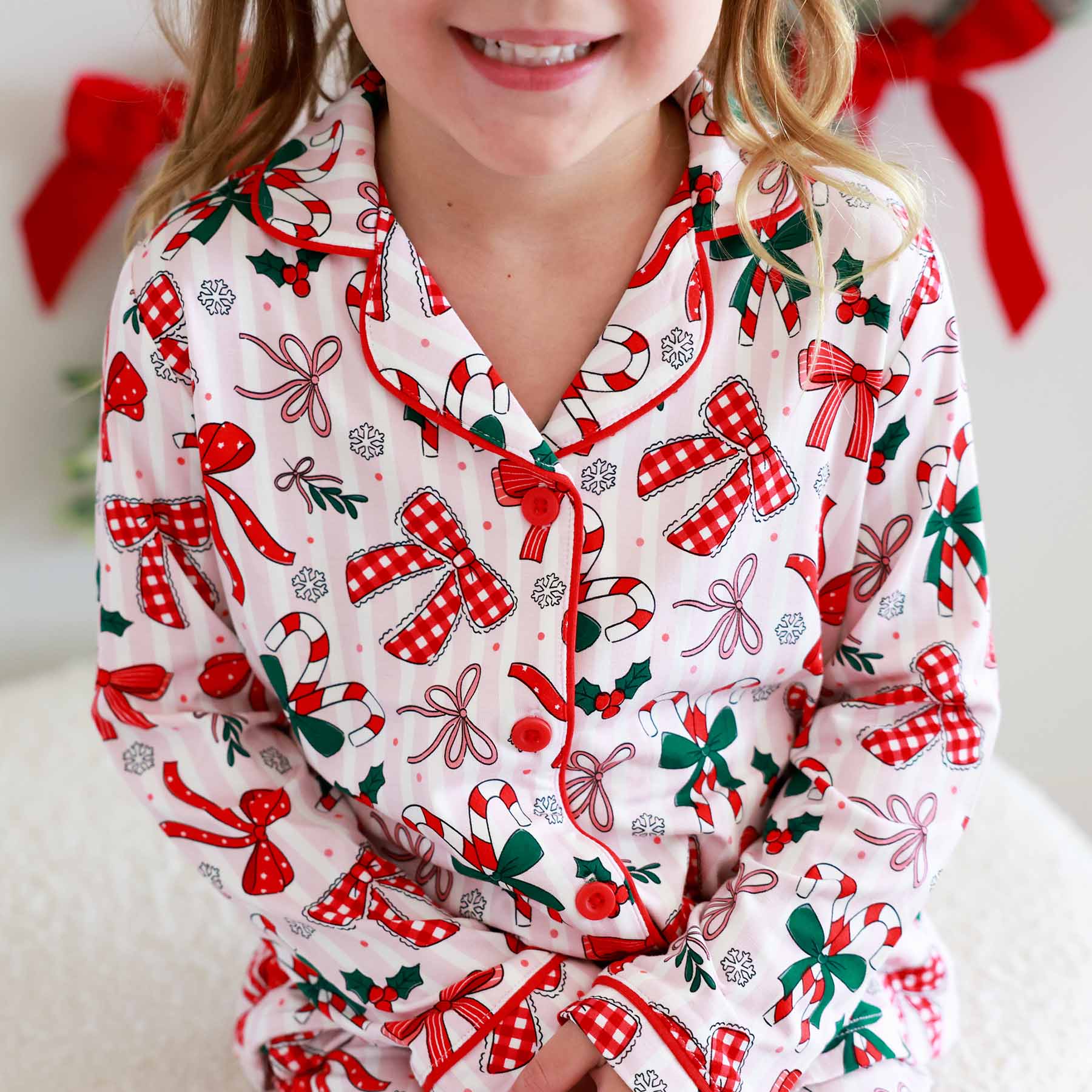 Festive, fun, and made to match, our Bow What Fun Girls’ Two-Piece Lounge Set is the perfect holiday outfit for your little girl. The button-up collared top feels polished yet playful, while the matching flared pants make it easy to twirl, lounge, or cuddle up with cocoa. Covered in candy canes, bows, holly, and snowflakes on pink stripes, this set is full of Christmas cheer. Made from buttery bamboo viscose, it is breathable, stretchy, and soft on sensitive skin. Perfect for holiday mornings with the family, baking cookies in the kitchen, or cozy nights by the fire, this set makes matching moments even sweeter.