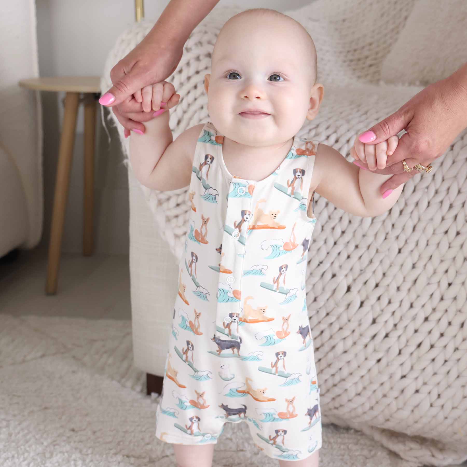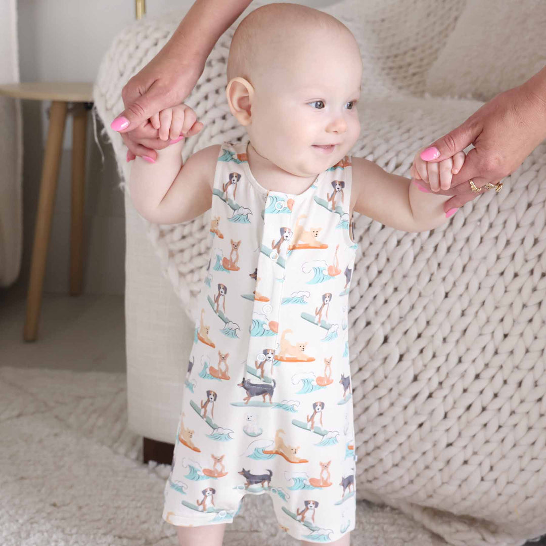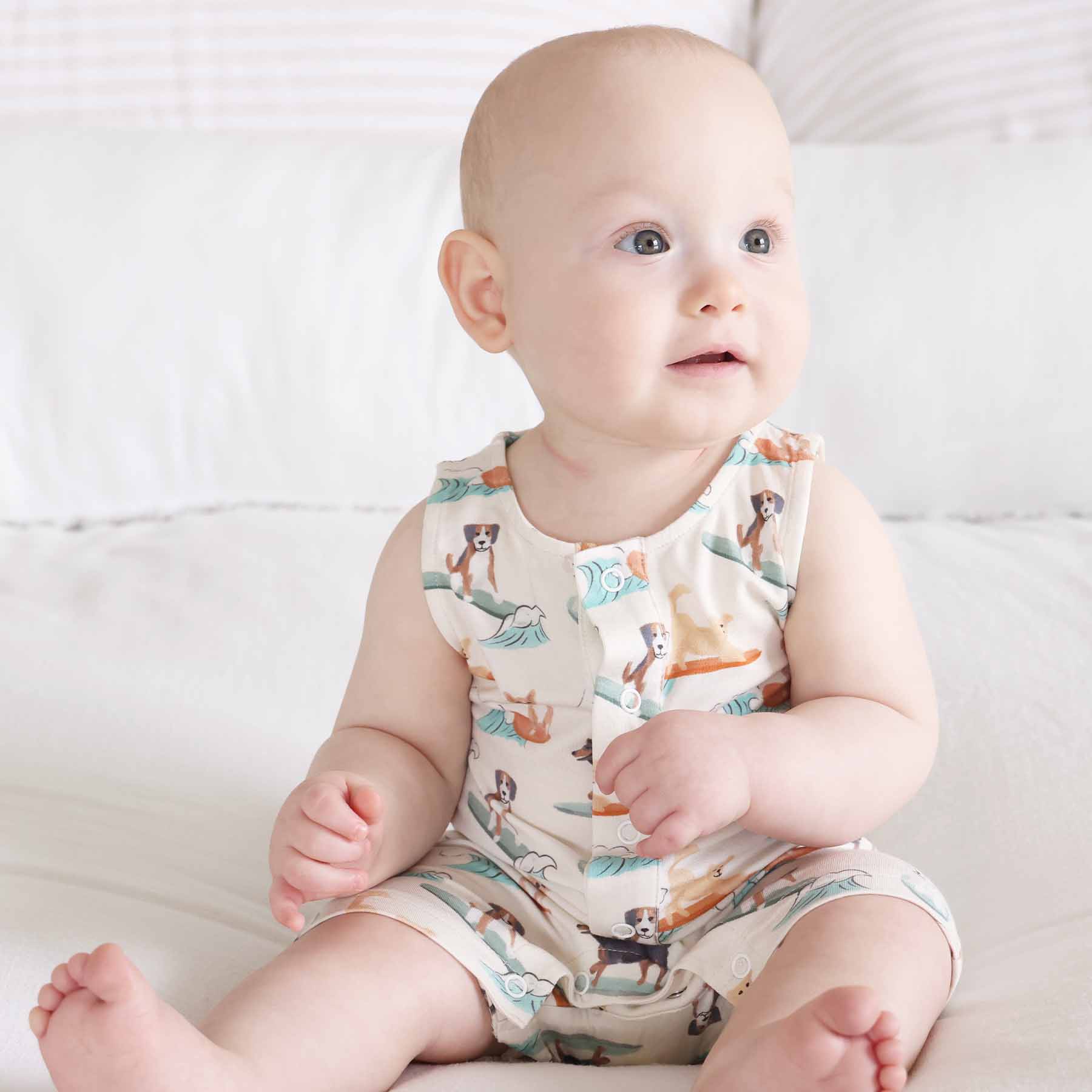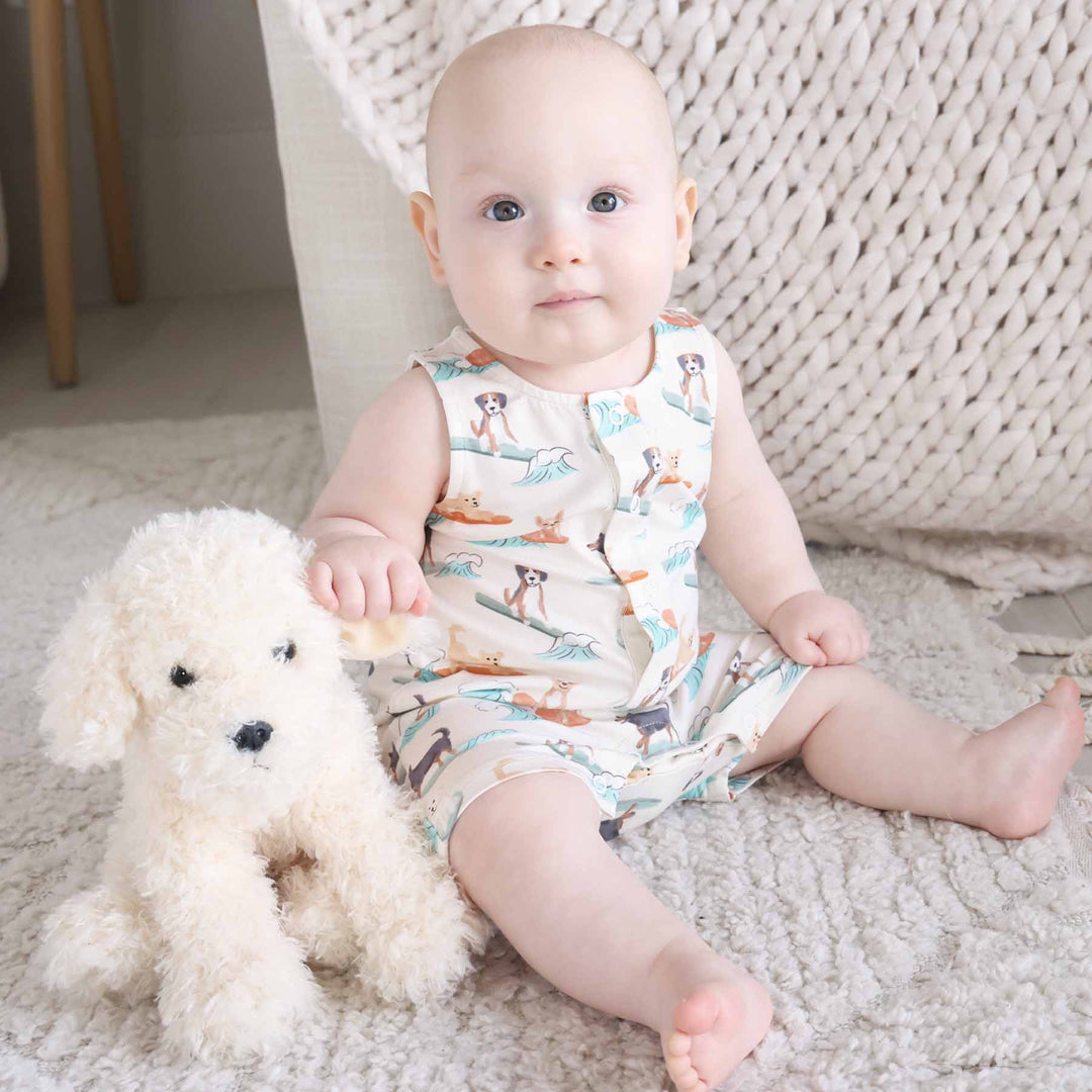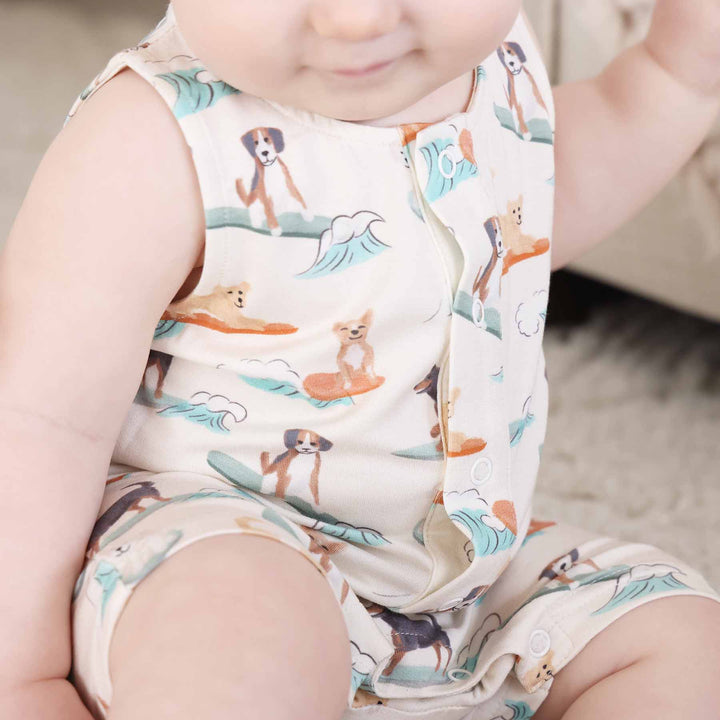 Surf’s up, baby! Our Paddle Pups Sleeveless Snap Romper is the ultimate summertime outfit for your little beach buddy. Made from our signature soft and breathable bamboo viscose fabric, this romper is as comfy as it is cute. Featuring an adorable all-over print of playful surfing pups riding the waves, this casual design is perfect for babies who are ready to soak up the sun in style. With a breezy sleeveless cut and built-in shorts, it’s designed to keep your baby cool and comfy during warm weather playdates, park adventures, or lazy summer strolls. The buttery-soft bamboo viscose is lightweight, gentle on sensitive skin, and naturally breathable — ideal for sunny days and active little ones. Whether you're headed to the beach, pool, or just out for some summer fun, this romper is the perfect outfit to keep your baby cool, comfy, and camera-ready. This playful surfing dog print will have everyone saying "aww!" while the stretchy, ultra-soft fabric ensures all-day comfort.