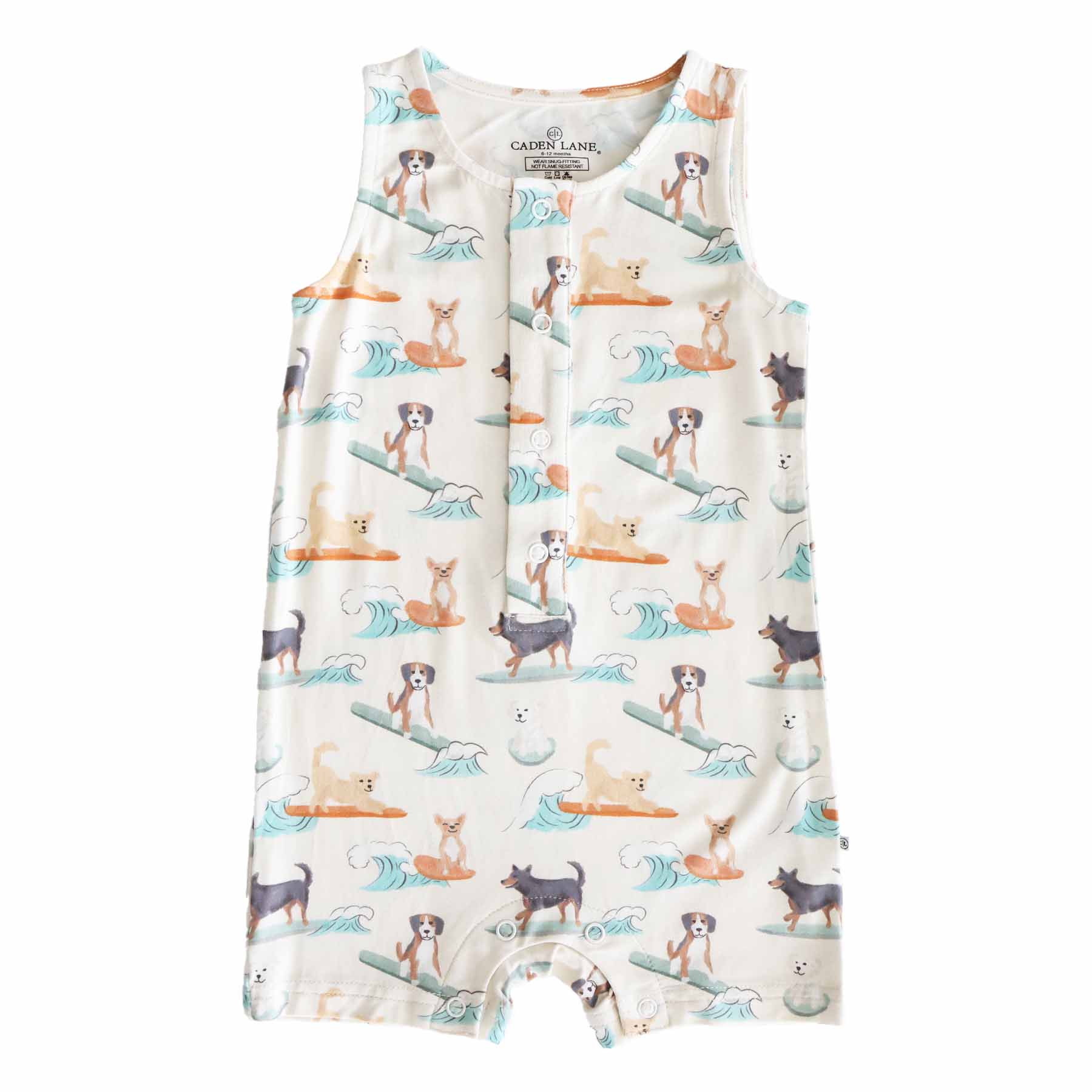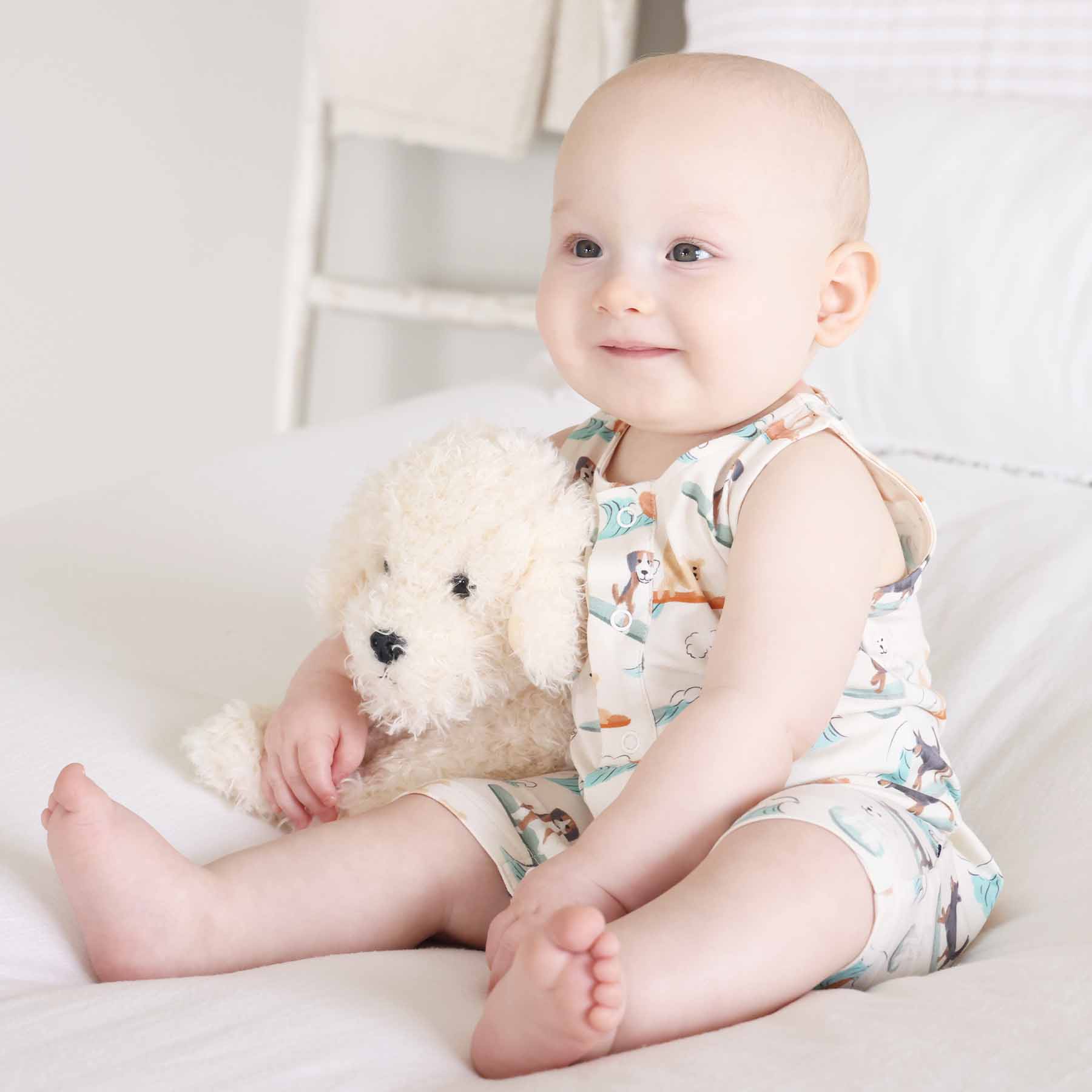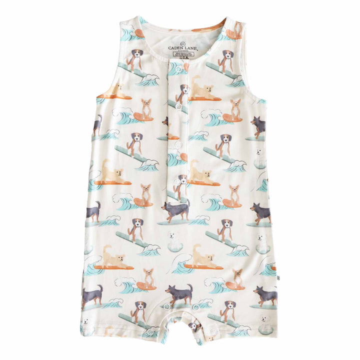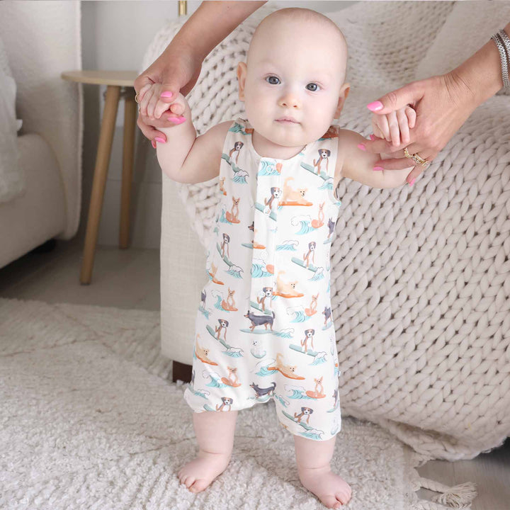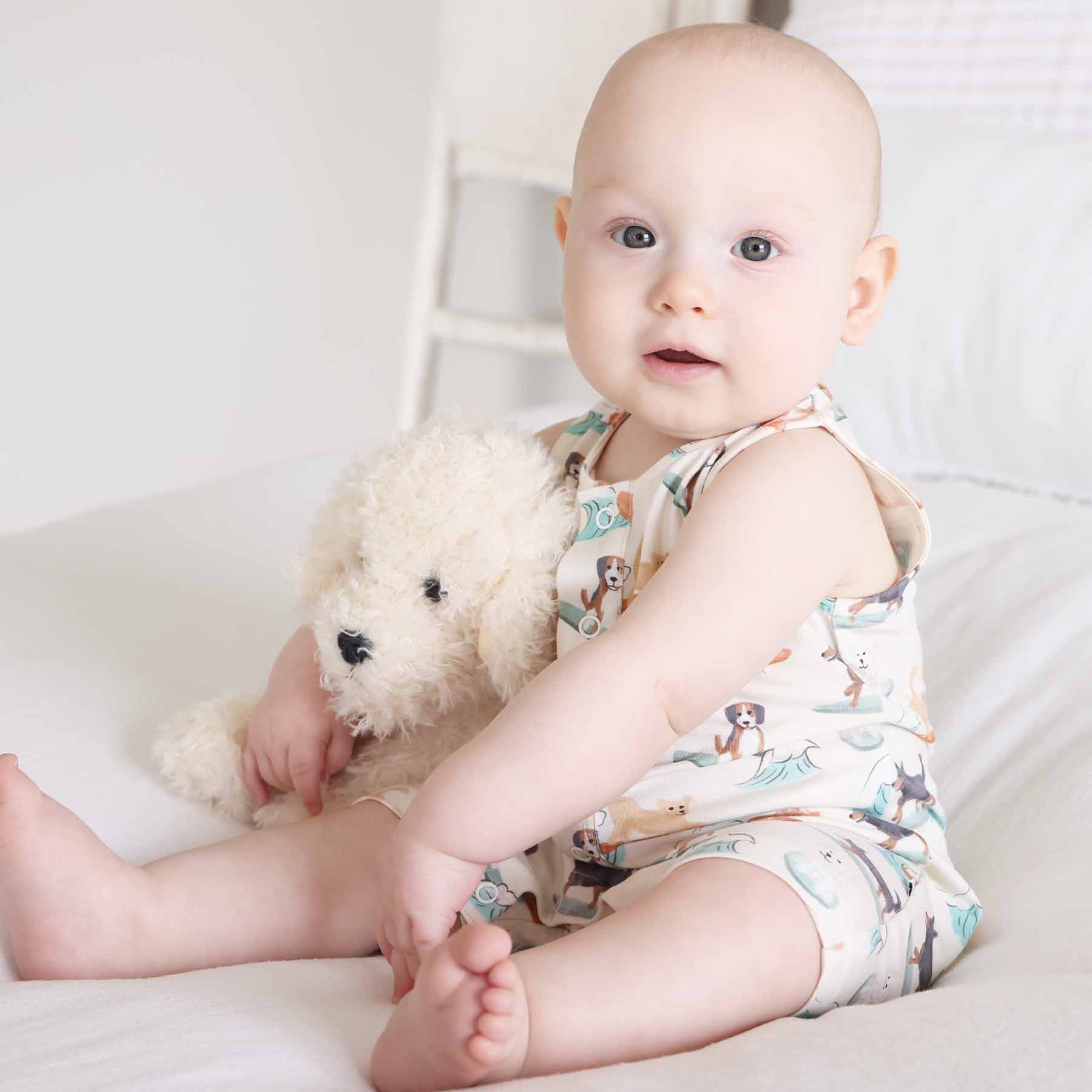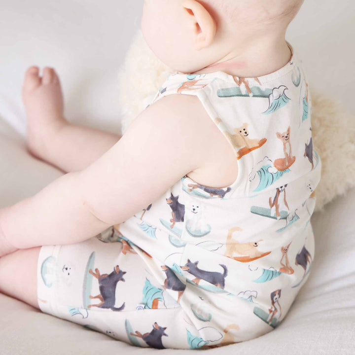 Surf’s up, baby! Our Paddle Pups Sleeveless Snap Romper is the ultimate summertime outfit for your little beach buddy. Made from our signature soft and breathable bamboo viscose fabric, this romper is as comfy as it is cute. Featuring an adorable all-over print of playful surfing pups riding the waves, this casual design is perfect for babies who are ready to soak up the sun in style. With a breezy sleeveless cut and built-in shorts, it’s designed to keep your baby cool and comfy during warm weather playdates, park adventures, or lazy summer strolls. The buttery-soft bamboo viscose is lightweight, gentle on sensitive skin, and naturally breathable — ideal for sunny days and active little ones. Whether you're headed to the beach, pool, or just out for some summer fun, this romper is the perfect outfit to keep your baby cool, comfy, and camera-ready. This playful surfing dog print will have everyone saying "aww!" while the stretchy, ultra-soft fabric ensures all-day comfort.
