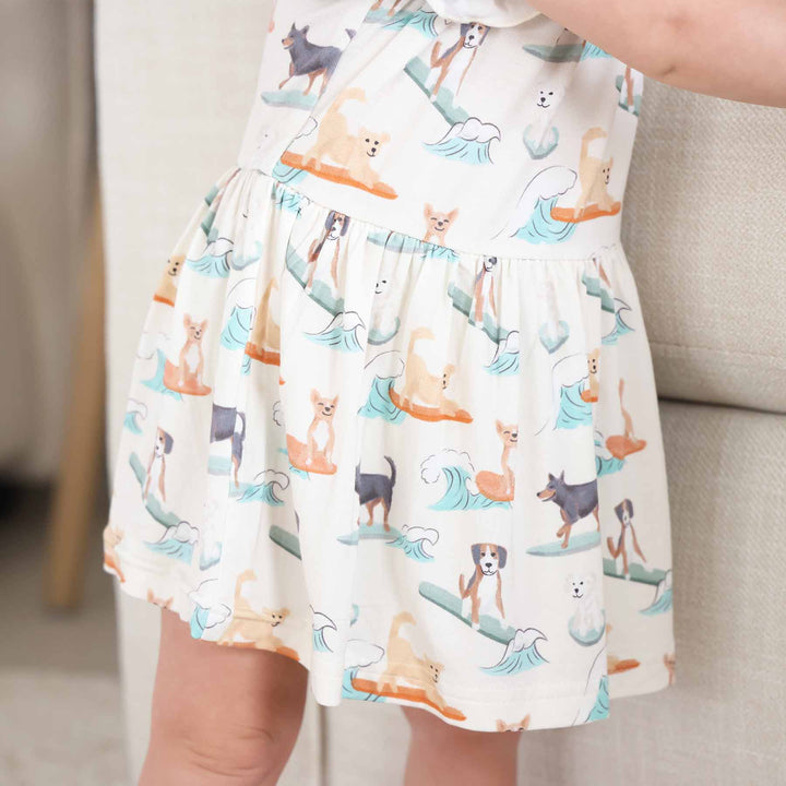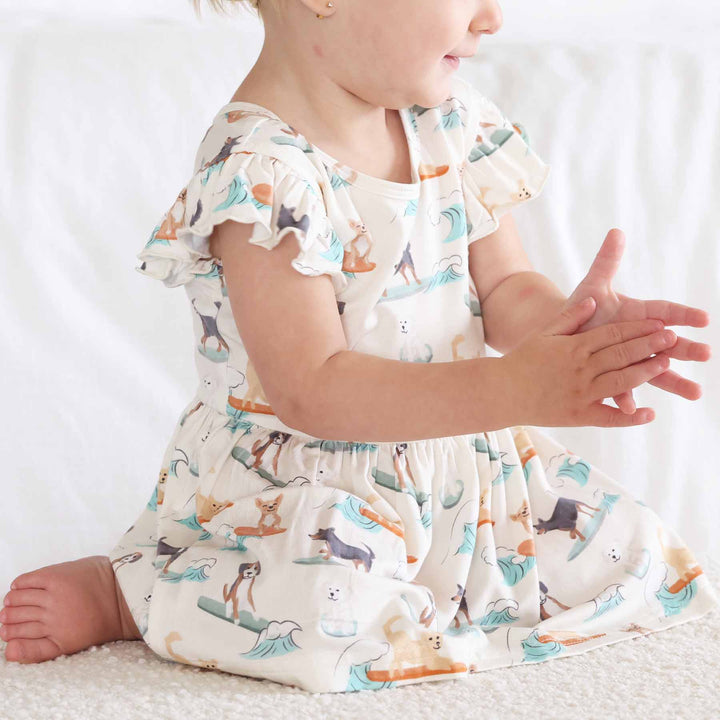 Your little beach babe will be riding waves of cuteness in our Paddle Pups Sleeveless Twirl Bodysuit! Made from our signature soft and breathable bamboo viscose fabric, this adorable outfit is perfect for warm-weather days filled with sunshine, giggles, and a whole lot of style. Featuring our Paddle Pups print with playful surfing dogs, this bodysuit brings a splash of fun to your baby or toddler girl’s summer wardrobe. The fluttery ruffle sleeves and twirly skirt add the sweetest girly touch — perfect for playdates, parties, or everyday cuteness. The lightweight bamboo viscose is buttery-soft, gentle on sensitive skin, and naturally breathable — keeping your little one cool and comfy all day long. The skirt design gives it a dress-like feel with all the convenience of a bodysuit, while the snap closures at the bottom make diaper changes quick and easy. Whether she’s twirling at the park, soaking up the sun, or just stealing the spotlight everywhere she goes, this ruffle skirt bodysuit is made for sunny adventures and everyday wear. The neutral tan background with pops of playful pups make it easy to mix and match with summer accessories, making this bodysuit the ultimate combo of comfort, style, and beach-day vibes. Cute, comfy, and full of sunshine — the Paddle Pups Sleeveless Twirl Bodysuit is made for little girls who love to play and look cute while doing it!