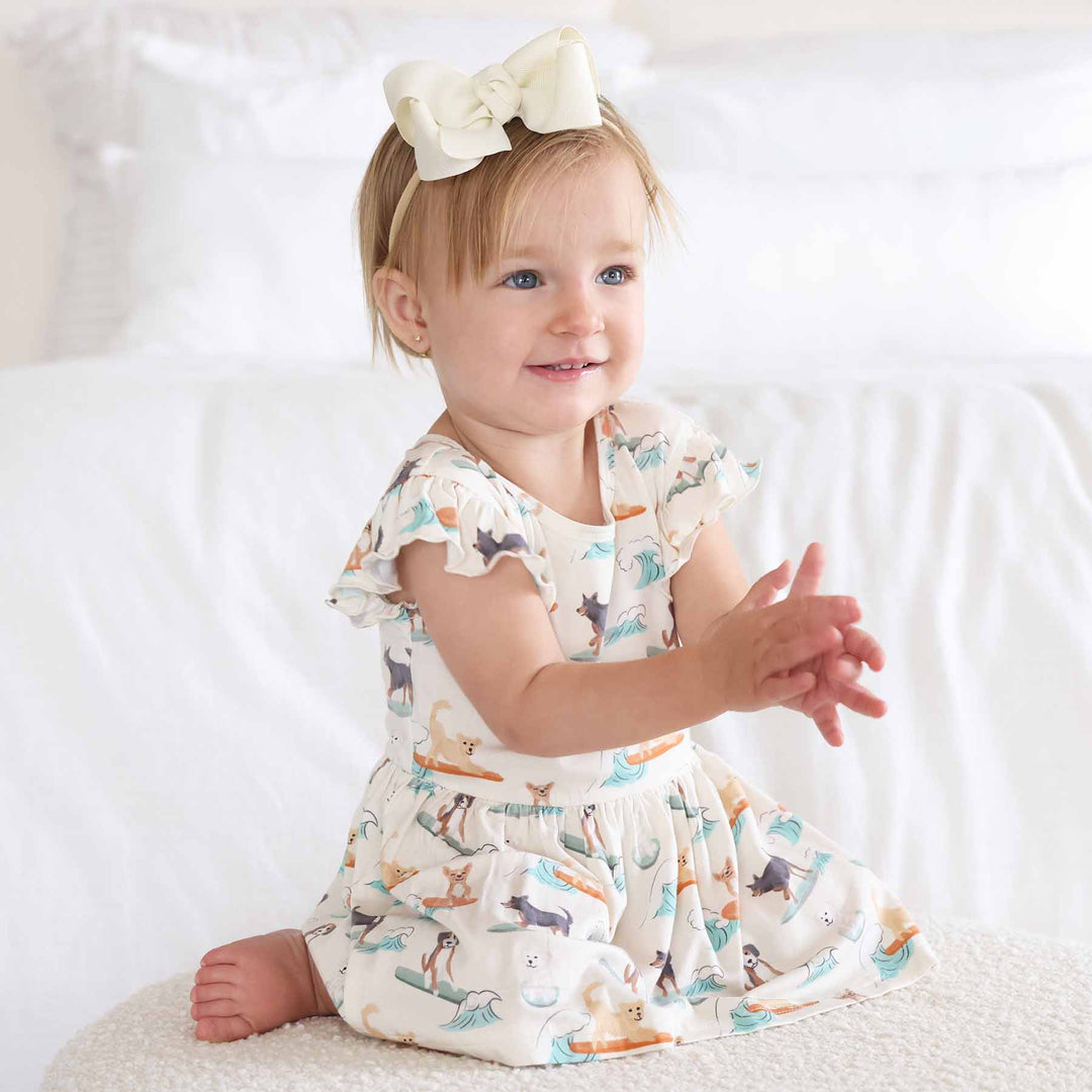 ruffle sleeve bodysuit with skirt for baby girls with surfing dogs