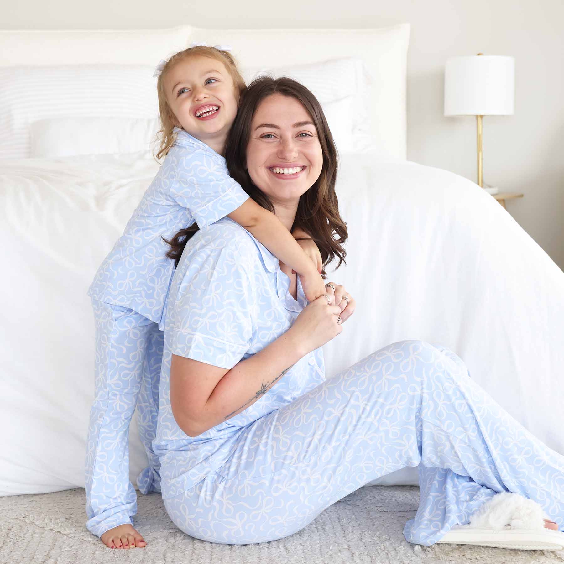 mommy and me matching pajamas blue-tiful bows