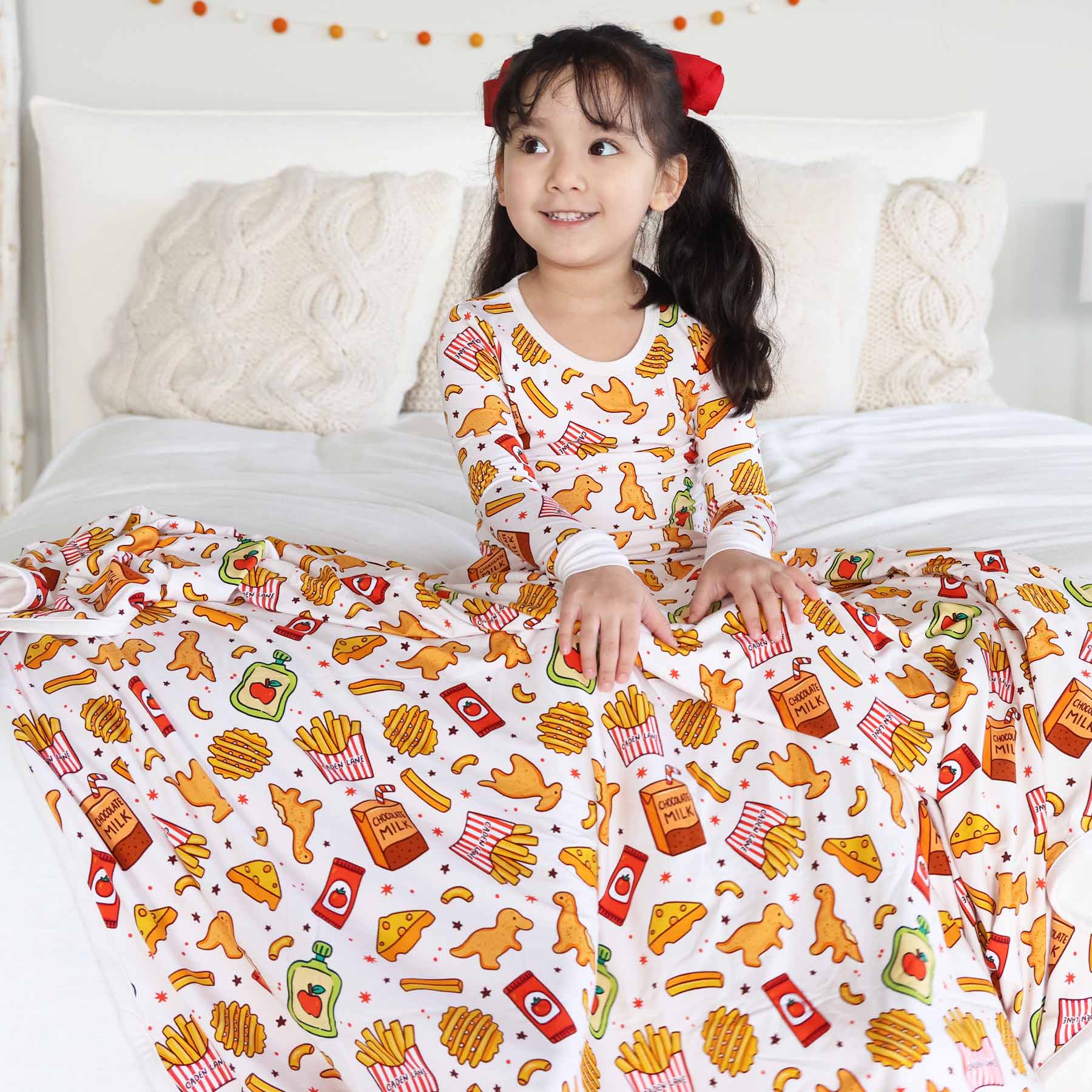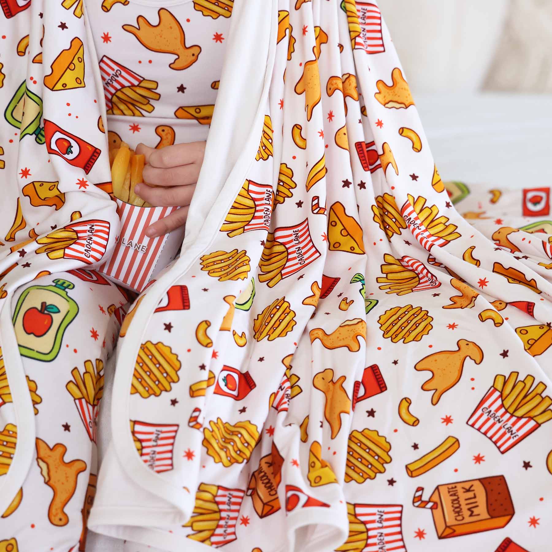 Tiny Bites brings the perfect blend of comfort and cuteness to snack time, snuggle time, and anytime! This double-sided bamboo blanket wraps your little one in buttery soft comfort with a playful mix of dino nuggets, fries, and chocolate milk on one side and a coordinating solid on the other. This Black Friday exclusive is lightweight, breathable, and perfectly oversized for cuddles that they won't be able to get enough of!