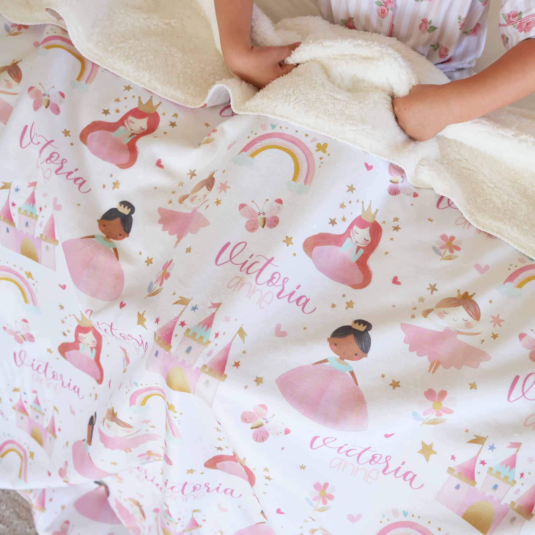 Every snuggle feels like a fairytale with the Personalized Sweet Princess Fuzzy Blanket! Featuring ballerinas, castles and pretty princesses, this enchanting print is made for little dreamers who love all things magical. Choose our smooth minky backing for velvety comfort or sherpa for extra-fluffy warmth that feels like a royal hug. Personalize it with her name to create a keepsake to make every moment feel like happily-ever after.