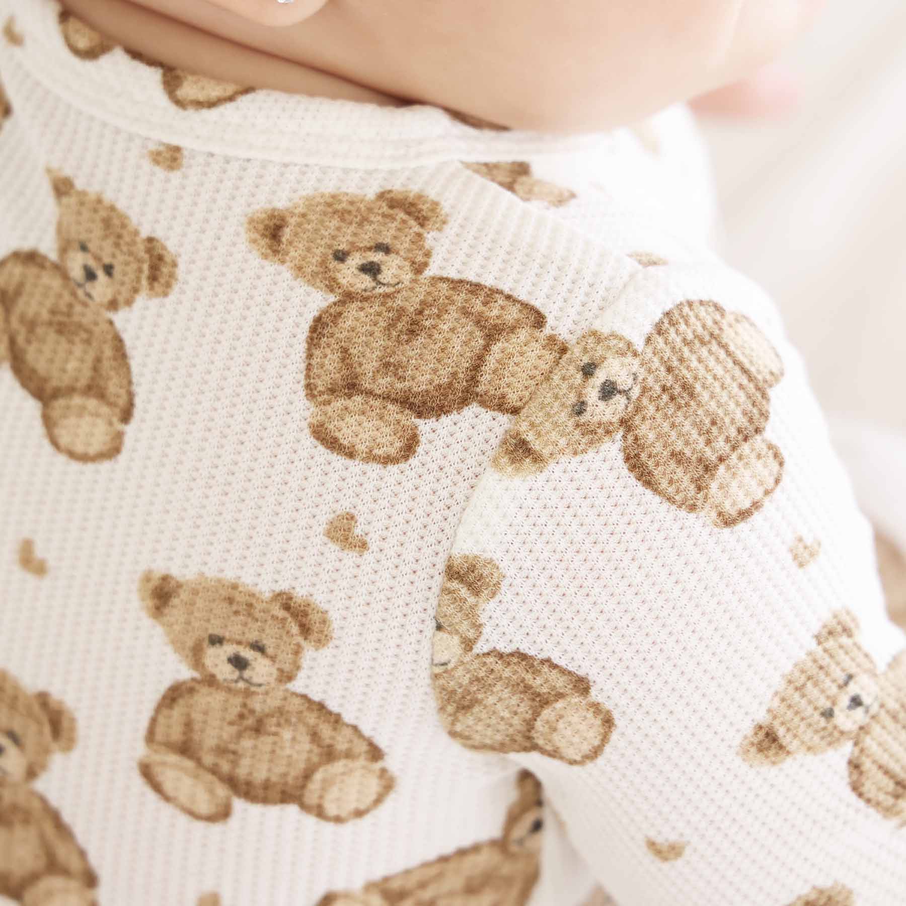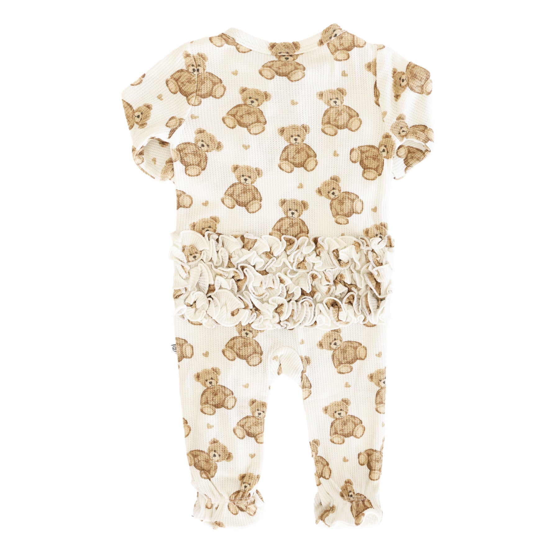 Cue the cuteness! Our Beary Sweet Ruffle Zipper Footie brings a touch of cozy to your baby girl’s wardrobe. Featuring teddy bears and dainty hearts on a soft white background, this ruffle footie is the perfect touch of sweetness. Made from ultra-soft, stretchy bamboo waffle fabric that was made for all-day comfort, this footie is ideal for everything from afternoon naps to morning playtime. A two-way zipper makes diaper changes quick and easy, while fold-over mittens help keep those tiny hands warm. Whether it’s her first outfit or part of a cuddly bedtime routine, this footie is full of love.