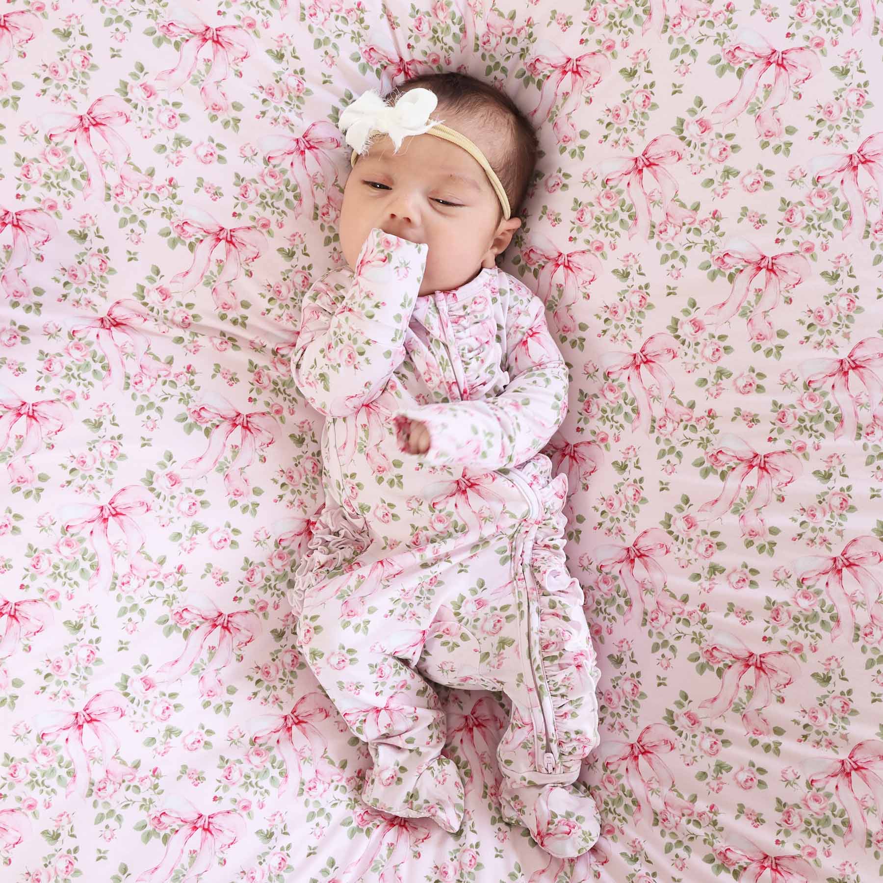 Soft, sweet, and ready for snuggles, the Bows in Bloom ruffle zipper footie is full of darling details that you won't be able to get enough of! Featuring blush pink florals and ribbon bows, this cozy one-piece is made from buttery-soft bamboo viscose that’s gentle on your baby’s delicate skin. Designed with a two-way zipper for easy changing and fold-over cuffs to protect tiny hands, this romper is as practical as it is precious. The ruffle details along the zipper and across the bottom add an extra touch of girly charm that's perfect for sleepy time, playtime, and everything in between. A cozy favorite with all the frills and all the feels that's perfect for gifting, everyday cuddles and mommy and me matching moments!