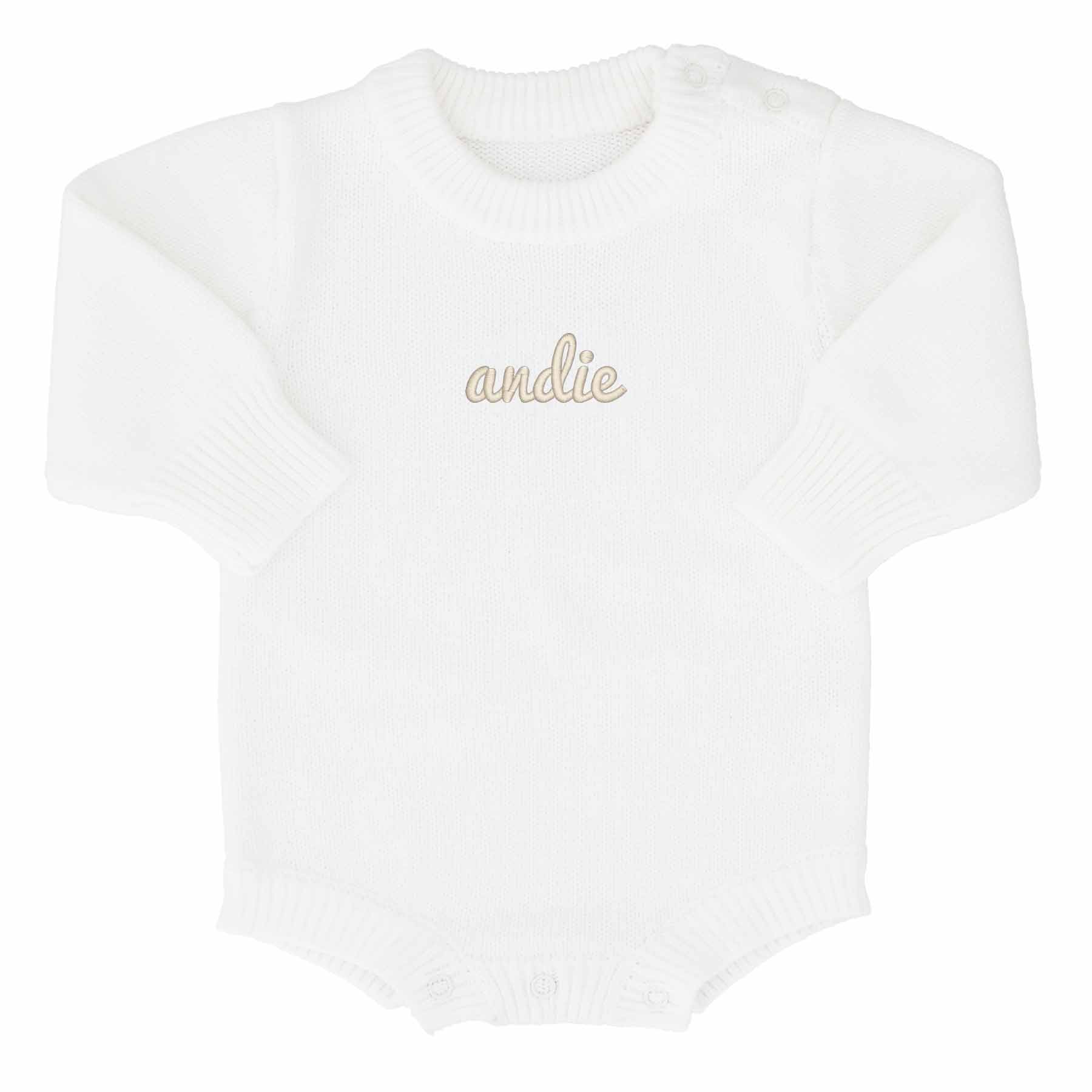 Looking for the cutest, cuddliest and most heartwarming outfit to cradle your baby? This embroidered personalized knit sweater bubble romper will be your little one's most lovable companion for countless snuggles and picture-perfect moments. Coming in a versatile white with fonts fit for boy or girl, this romper complements every style and will be loved by parents who are looking for the cutest cool weather outfit for their baby. Pair with the matching beanie and booties for the perfect outfit to announce your little one's name as they venture home from the hospital for the first time, and keep your newborn nice and toasty while picking up the cutest keepsake!
